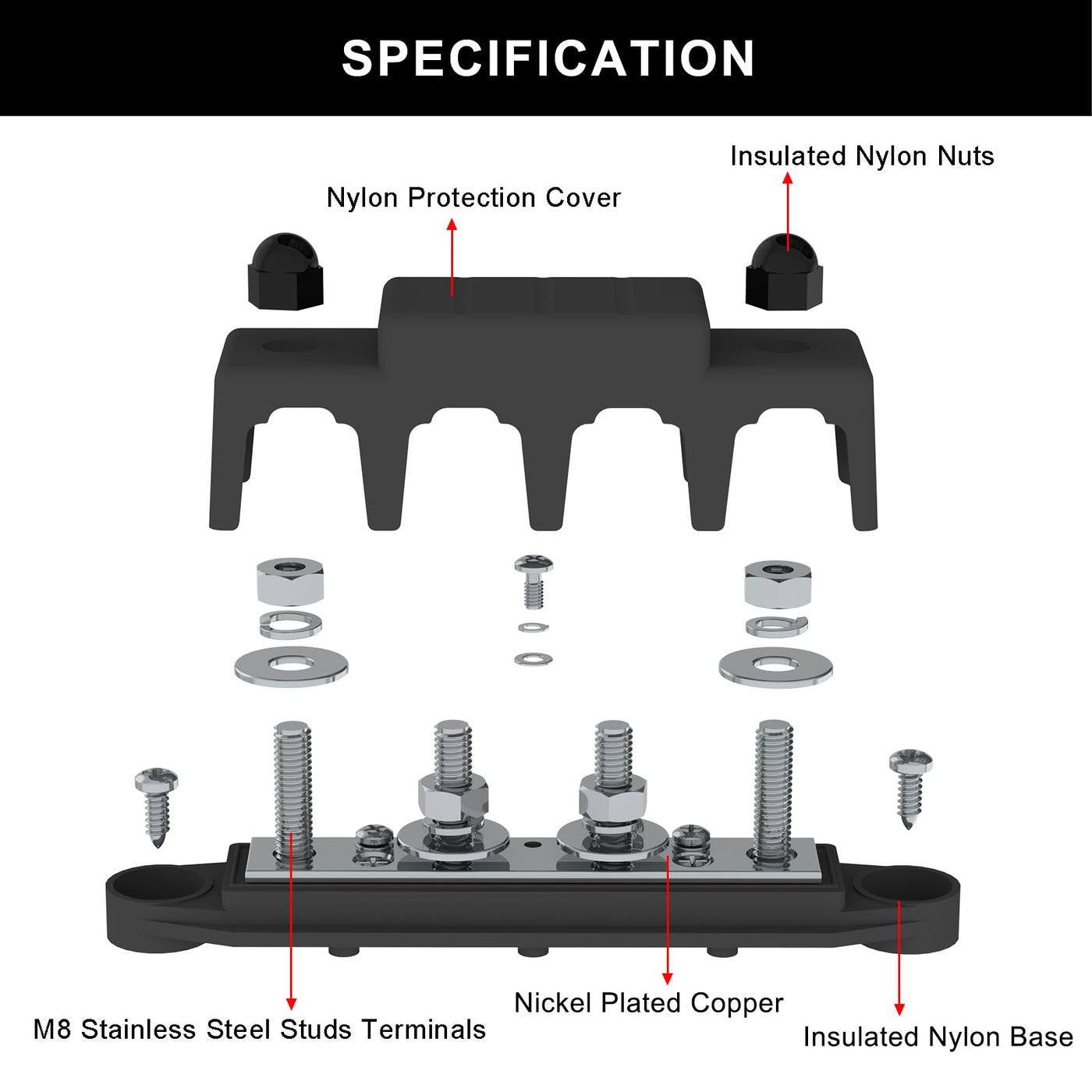 Q: What is the maximum current rating of the Bus Bar 250A 12V Power Distribution Block?A: The Bus Bar 250A Power Distribution Block is designed to handle up to 250A of current at 12V and can also accommodate a maximum of 48V, making it suitable for various power distribution needs.