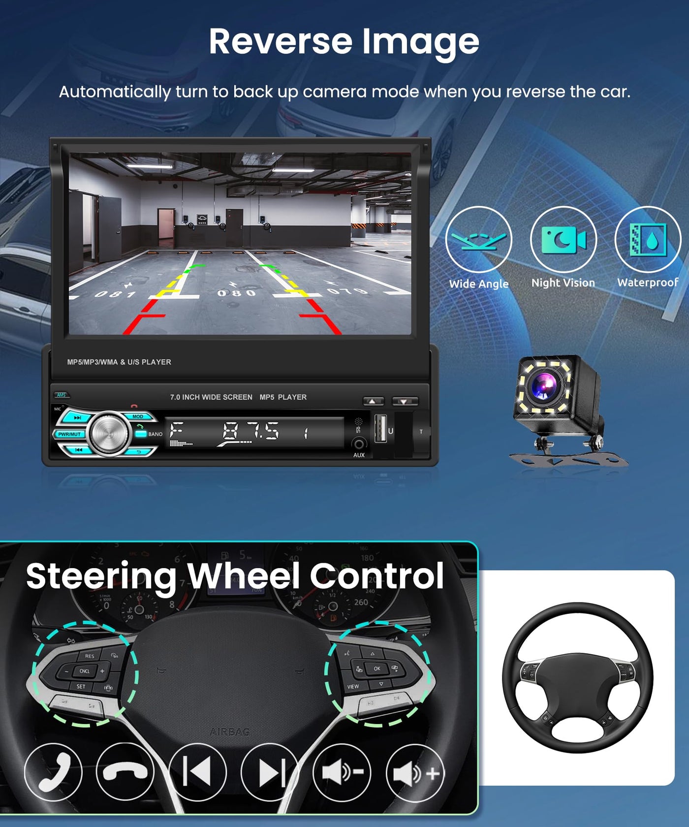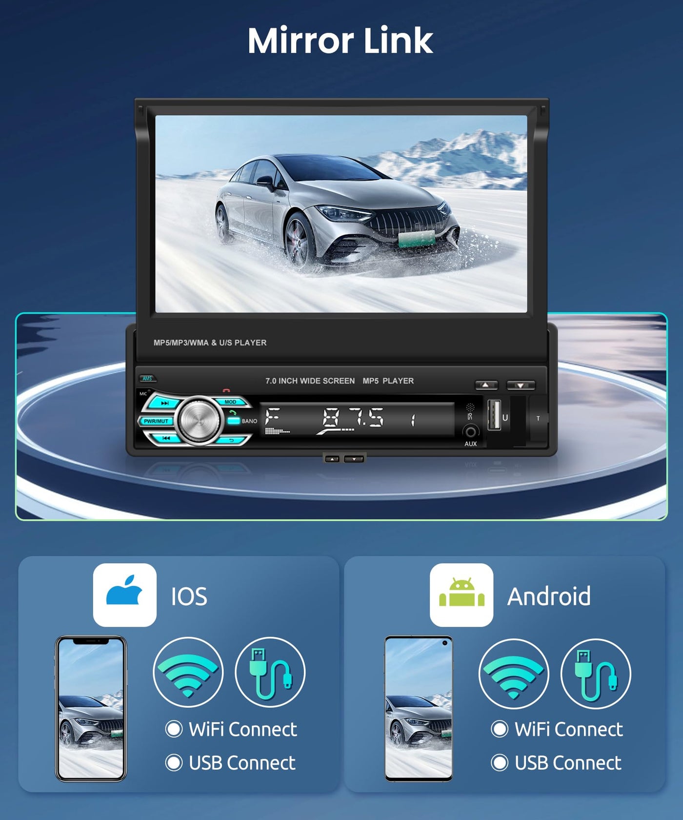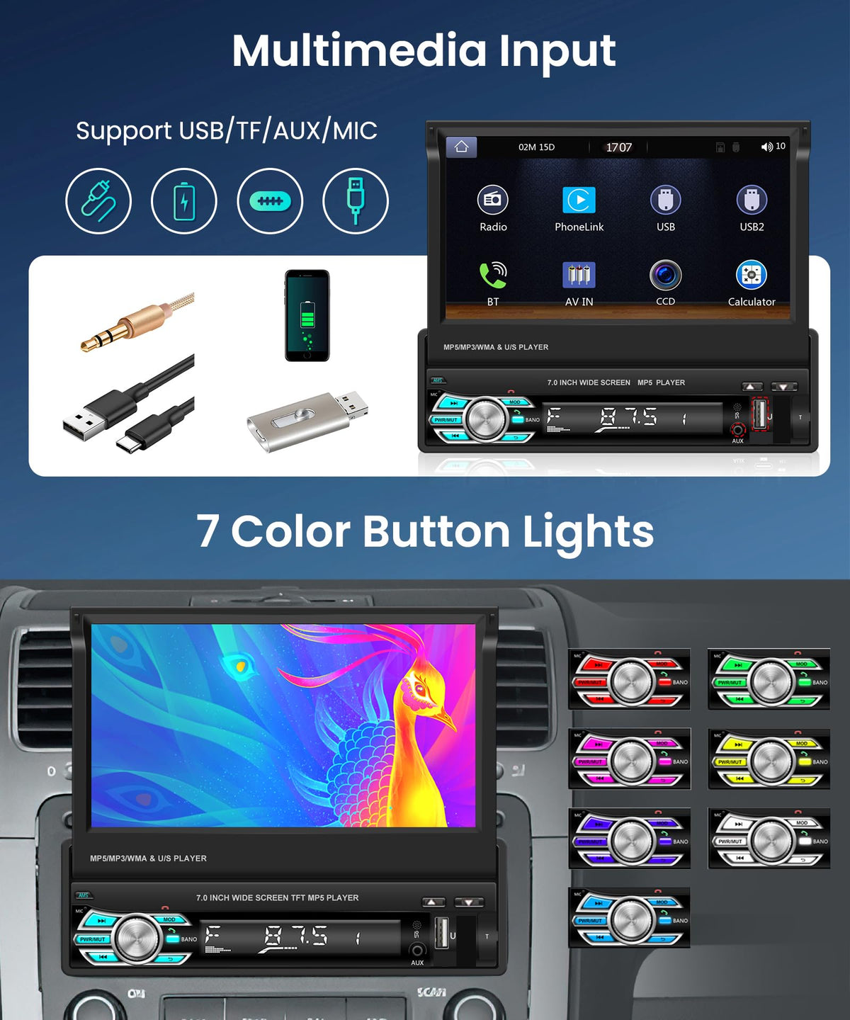 Car Stereo Single Din Touchscreen Car Radio With Bluetooth, Rimoody 7 Inch Electric Flip Out Screen Mirror Link Fm Radio Aux In