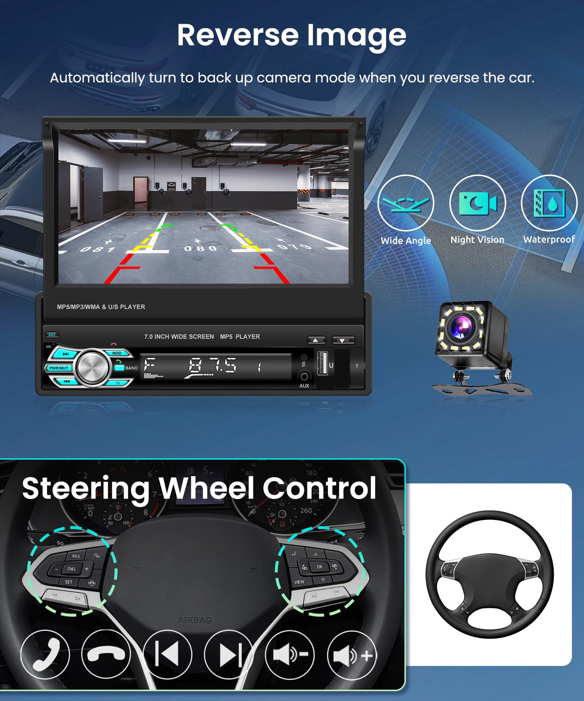 Features ?7-Inch High Definition Touch Screen, Capacitive Folding Touch Screen. ?Support Sd Card, High-Speed Usb2.0 Interface Is Compatible With A Variety Of U Disk, Removable Hard Drive, Hot-Swappable. ?Multiple Playback Modes:Support Usb Playback&Aux Music Playback&Bluetooth Playback. ?Hardware Electronic Sounds (Eq) Processing, Multiple Eq Modes, Treble And Bass Can Be Adjusted. ?Support Android/ Iphone Mirror Link: Ios One-Way: Ios Supports Mobile Phone One-Way Projection To The Machine Android Two-Way: Android Supports Mobile Phone Two-Way Connection ?Full Digital Electronic Control Search Radio Stations, High-Performance Digital Tuning Fm Radio Automatically Scans, 18 Stations Memory ?Song Memory Function:Your Mp3 Player Doesn'T Restart The First Song When The Power Fails. ?Rear View Camera Input Function: Come With A Camera, Connect To A Car Backup Camera, The Car Stereo Monitor Will Turn To Rear View Reversing Details Automatically. ?Steering Wheel Control:Support Steering Wheel Button Learning Function, Through It You Can Control The Functions That You Need By Steering Wheel, More Convenient Specifics Voltage:Dc12V System:Wince Screen Size:7'' Retratable Front Panel Mirror Link:Support Radio Band:Fm Power Output:60W Radio Frequency:87.5-108Mhz Audio Format:Mp3/Wma/Wav/Ape/Flac Video Format:Rm/Rmvb/Avi/Mp4/Mkv/3Gp Picture Format:Jpg Package Included 1 X Car Mp5 1 X Power Cable 1 X Remote Control 2 X Disassemble Key 1 X English Instruction Manual 1 X Backup Camera Rimoody Has Professional Technical Team And Great Service, We Offer 30-Day Money-Back, 12-Month Replacement, Life-Time Technical Support.