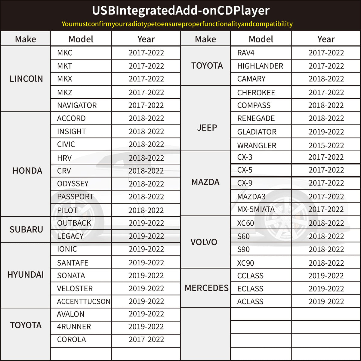 Q: Is this USB CD player compatible with all car models?A: This USB CD player is designed to work with specific vehicle models that have a USB processing HUB. Please refer to the vehicle fit guide available in the product images to ensure compatibility with your car's make and model.