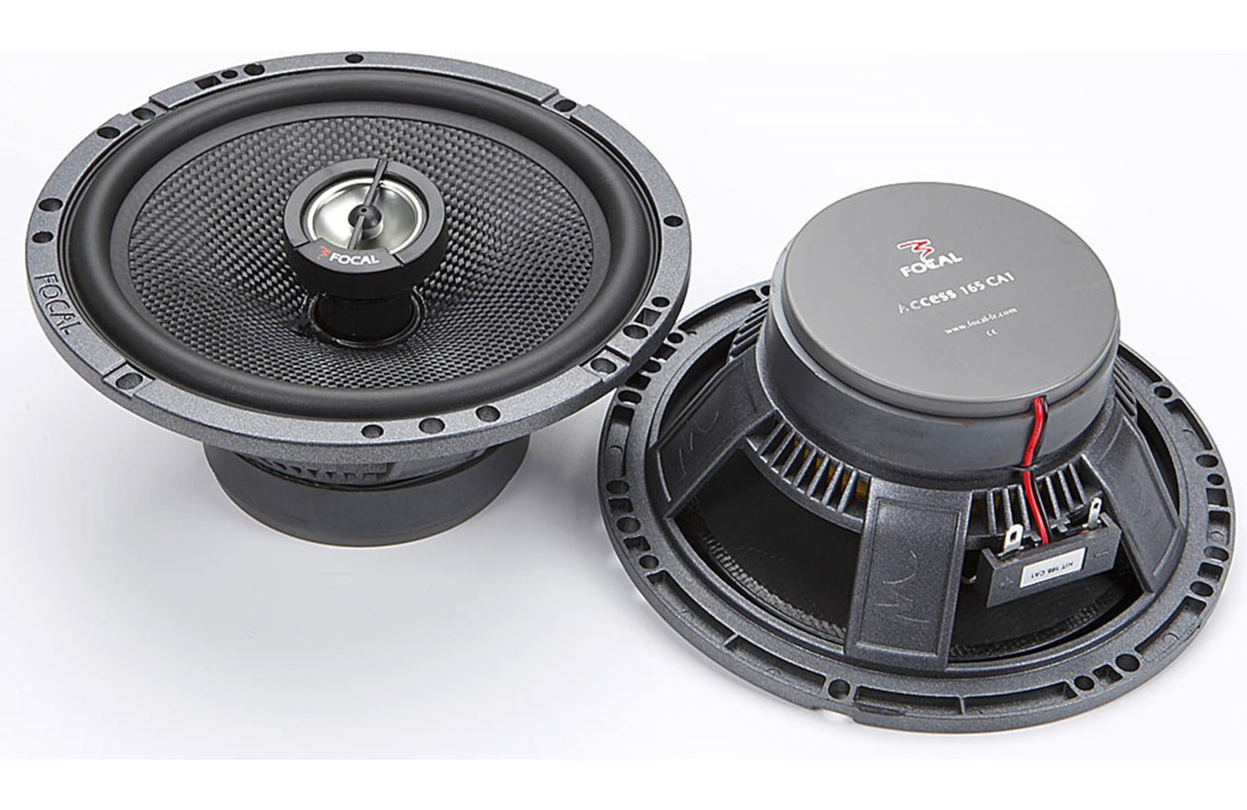 Q: What are the key features of the Focal Access 165 CA1 coaxial speaker kit?A: The Focal Access 165 CA1 coaxial speaker kit features a 6.5-inch design with a built-in crossover, 120 watts maximum power handling, a 4-ohm impedance, woven glass fiber woofers, and aluminum inverted dome tweeters. These elements work together to create a wide soundstage and accurate sound imaging.