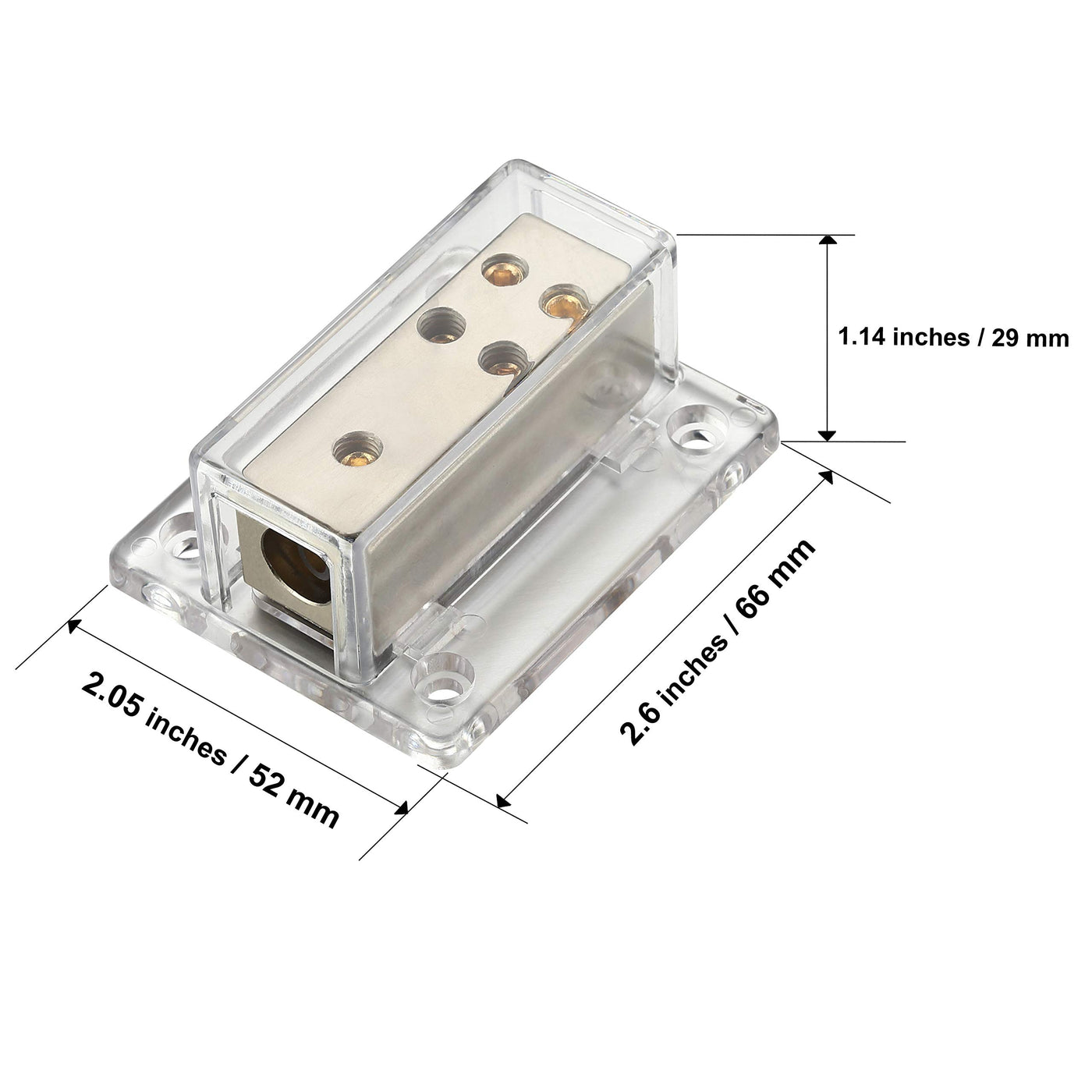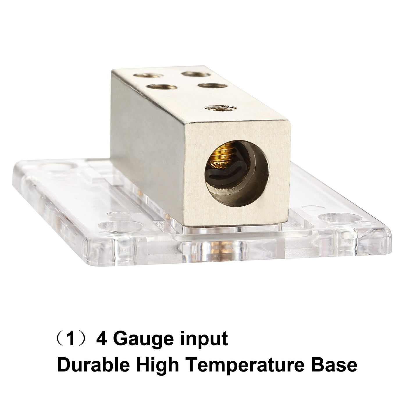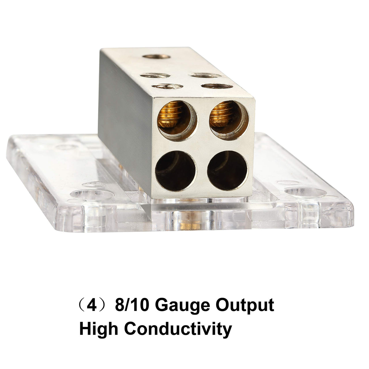 Freajoin 4/8/10 Awg Gauge Power Distribution Block 4 Gauge In - ( 4 ) 8/10 Gauge Out, Satin Nickle Plated Internal Material And High-Strength Clear Housing
