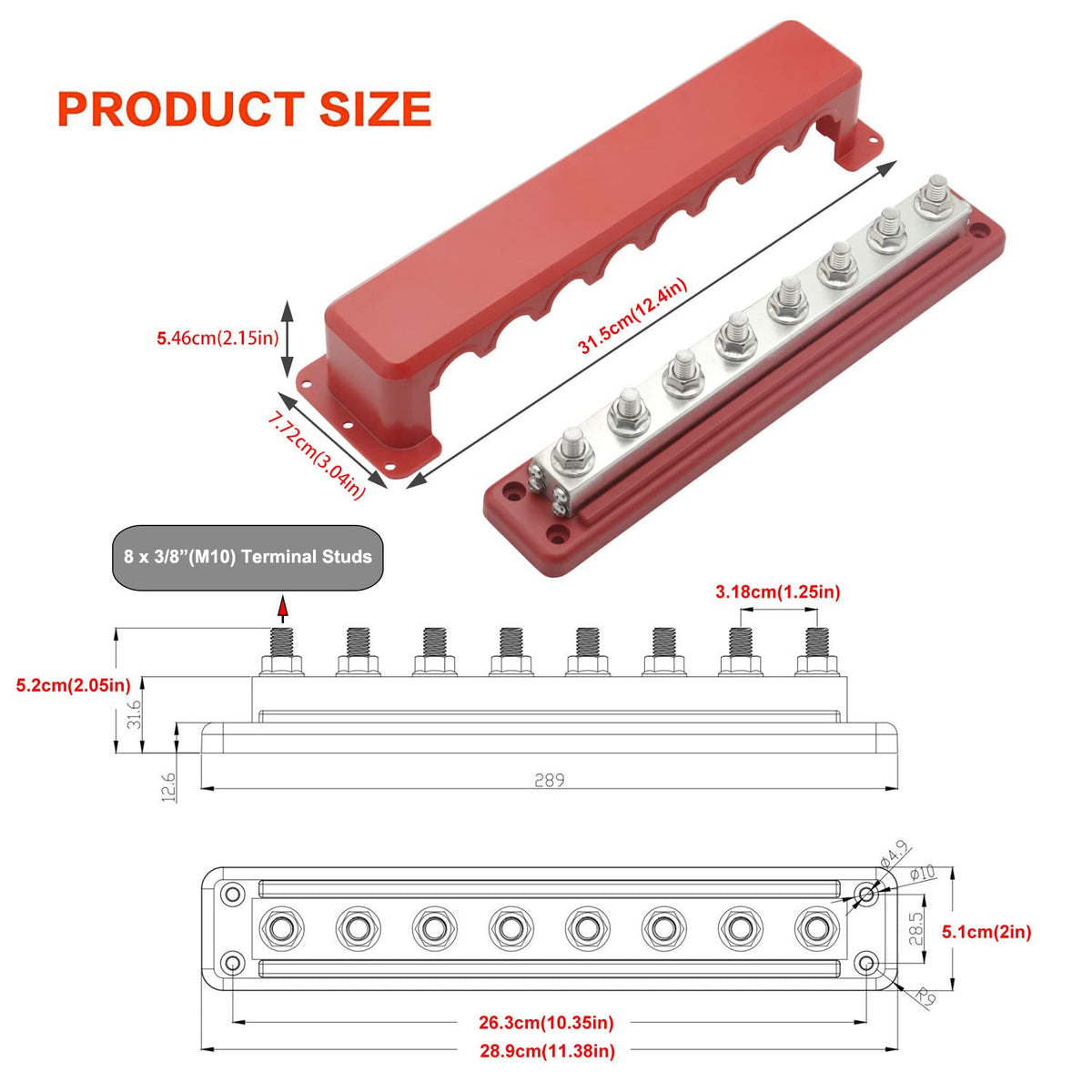 Specifications: Base & Cover Material: Flame-Retardant Polycarbonate( Pc) Base Bus Material: Tin-Plated Copper Stud Material: Stainless Steel 316 Max Voltage: 300V Ac / 48V Dc Continuous Rating: 545A Ac / 600A Dc Terminal Stud Size: 8 X M10( 3/8'' ) Dimension (Lxwxh) Approx. 11.37'' X 2'' X 2'' (289X51X51Mm) Package Include: 1 X 600A Busbar With Cover