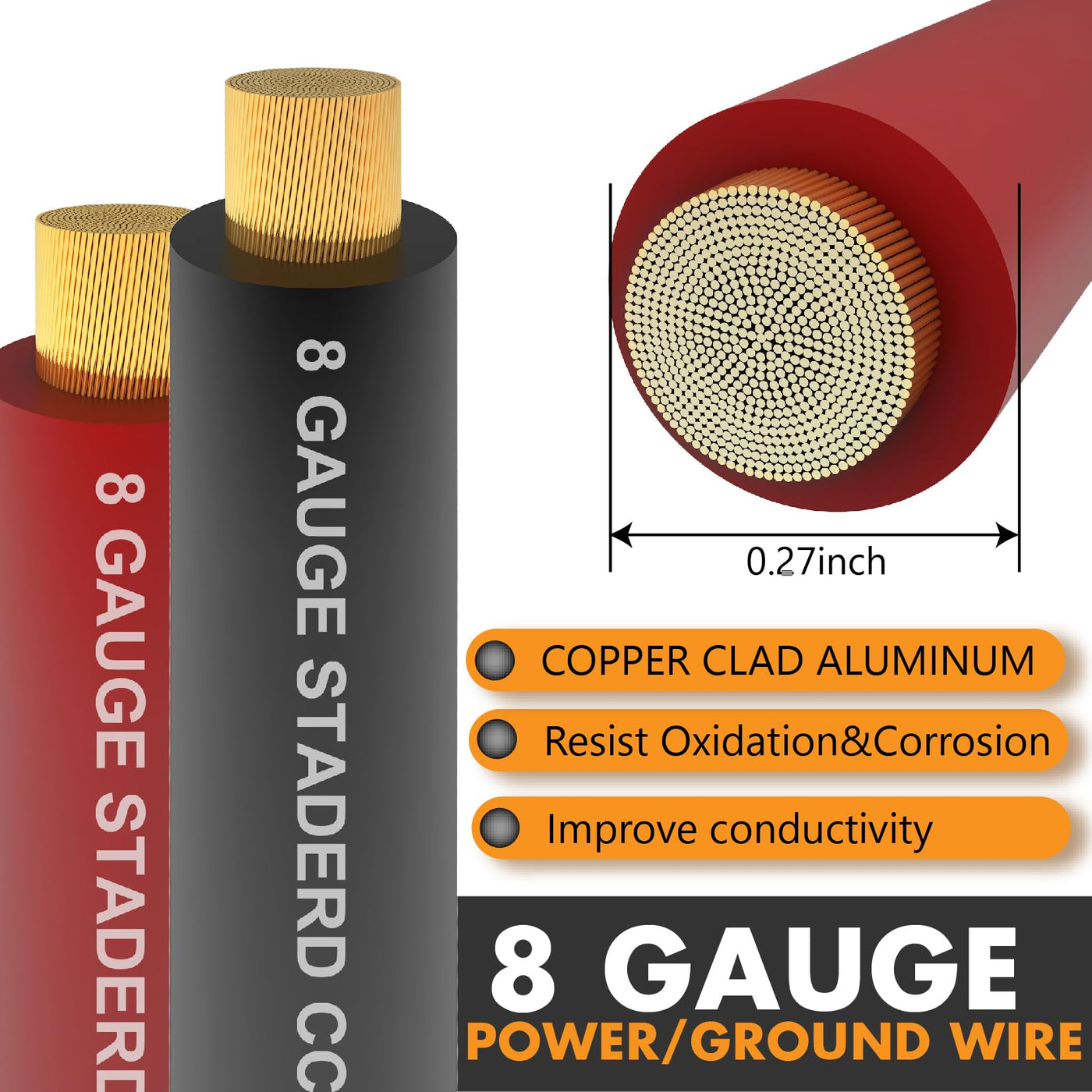Q: How long is the wire included in the Jeemiter 8 Gauge set?A: The Jeemiter 8 Gauge Wire set includes a total of 100 feet of wire, with 50 feet in red and 50 feet in black. This length is perfect for a variety of installation needs.