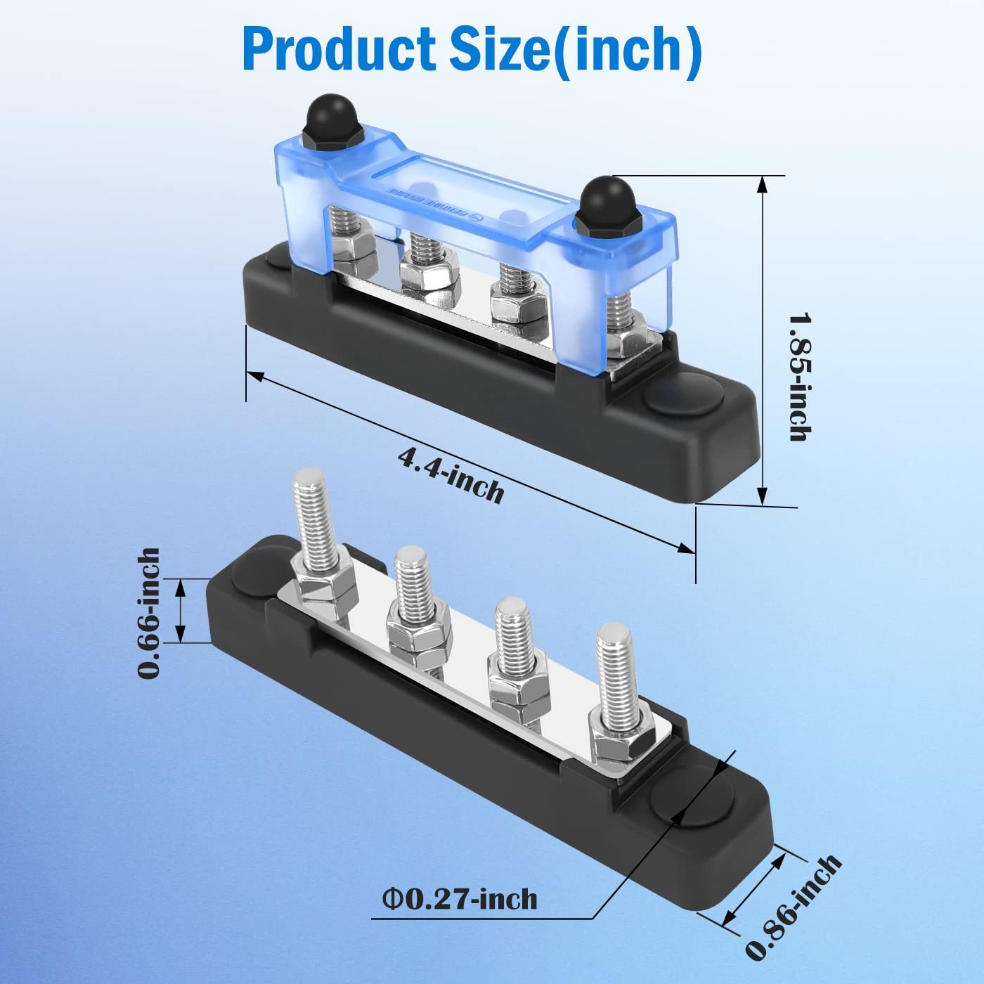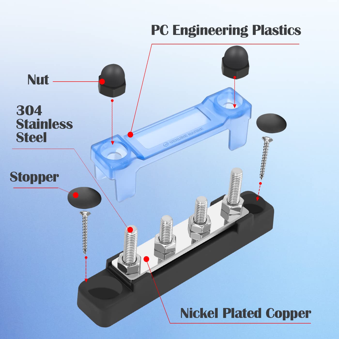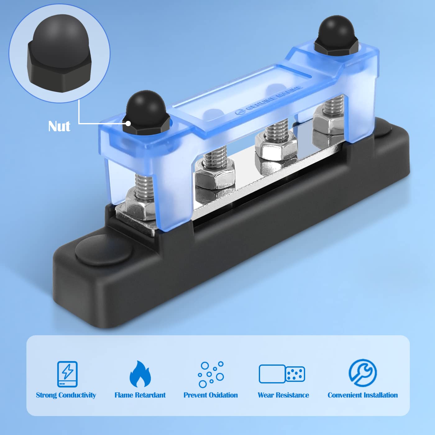 Q: How does the protective cover enhance safety during use?A: The blue protective cover made of PC material safeguards the bus bar from accidental contact, while the washer design nuts ensure a secure connection between the nut, wire lug, and terminal block, improving safety during installation.