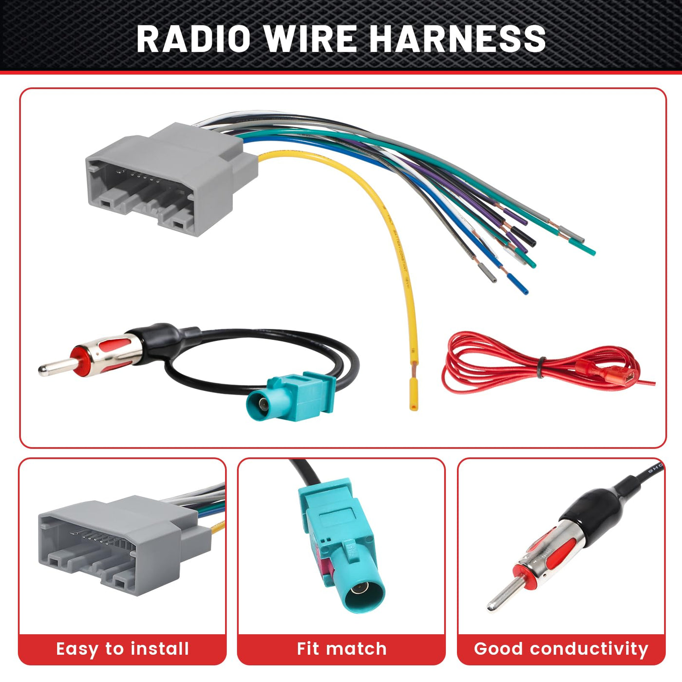 Q: What material is the RED WOLF Radio Wiring Harness made from?A: The wiring harness is made of high-quality materials, including pure copper for excellent conductivity and a flexible PVC shell for durability and wear resistance.