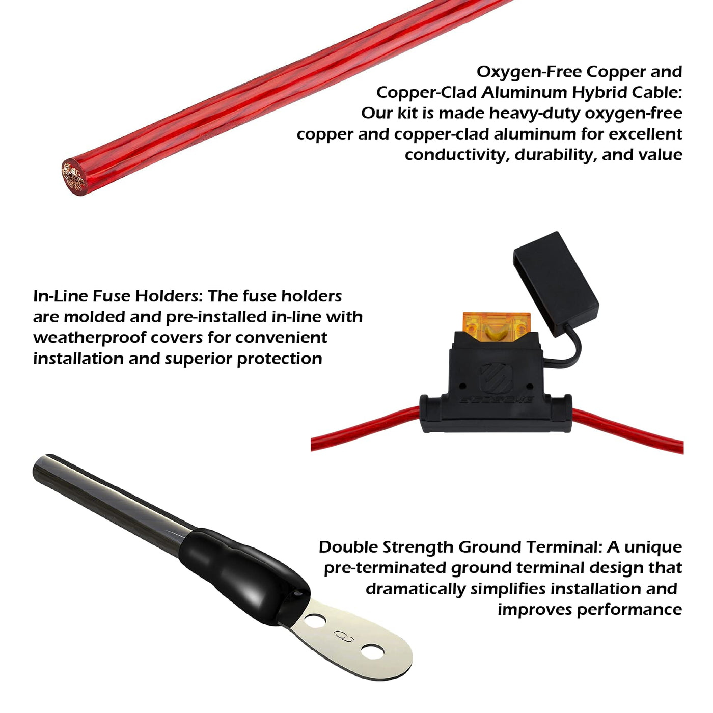 Q: What makes the Scosche ICAK104 wiring kit suitable for high current applications?A: The Scosche ICAK104 wiring kit features a 10 gauge hybrid power cable made from a blend of heavy-duty oxygen-free copper (OFC) and copper-clad aluminum (CCA), ensuring excellent conductivity and durability for high current applications.