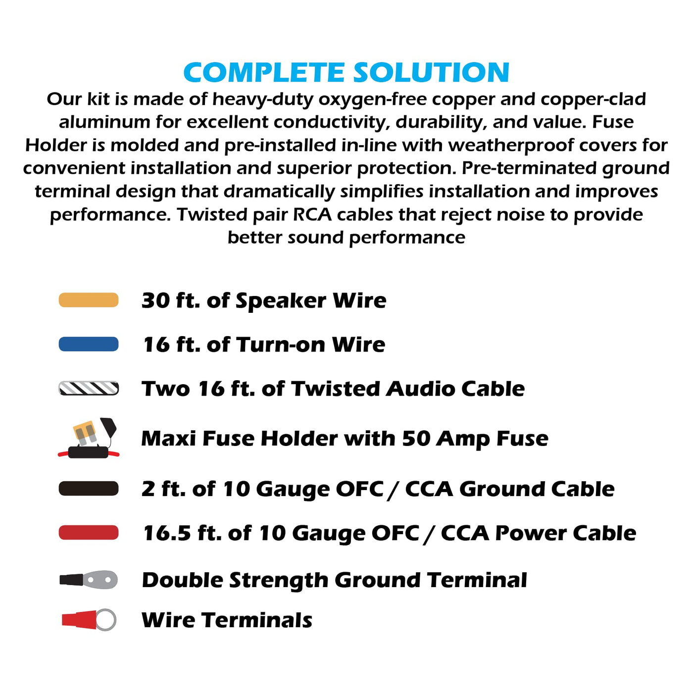 Descriptionthe Install Centric Icak104 True 10 Gauge 4-Channel Amplifier Wiring Kit Is Compatible With Systems Up To 420-Watt Max Or 240-Watt Rms. Our Kit Is Constructed With Actual 10-Gauge Heavy-Duty Oxygen Free Copper And Copper Clad Aluminum Hybrid Power Cable For Excellent Conductivity, Durability And Value. The Maxi And Atc Fuse Holders Are Molded And Pre-Installed In-Line With Weatherproof Covers For Convenient Installation And Superior Protection. The Double Strength Ground Terminal Features Unique, Pre-Terminated Ground Terminal Design That Dramatically Simplifies Installation And Improves Performance. The Twisted Pair Rca Cables Reject Noise To Provide A Better Sound Performance. Includes:16.5 Ft. Of True 10-Gauge Hybrid Ofc/Cca Blend Power Cable, 2 Ft. Hybrid Ofc/Cca Blend Ground Cable, (2) X 16 Ft. Twisted Audio Cable, 16 Ft. Remote Turn-On Wire, 50 Ft. Speaker Cable, Maxi Fuse Holder With 40A Fuse, Pre-Terminated Double-Strength Ground Terminal, Wire Ties And Amplifier Terminals.