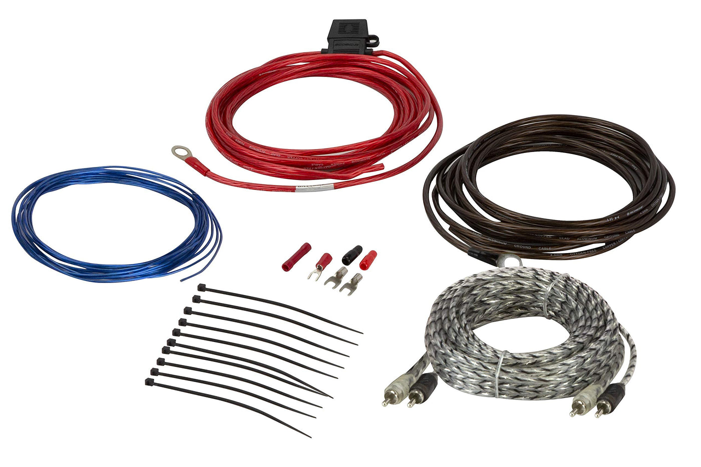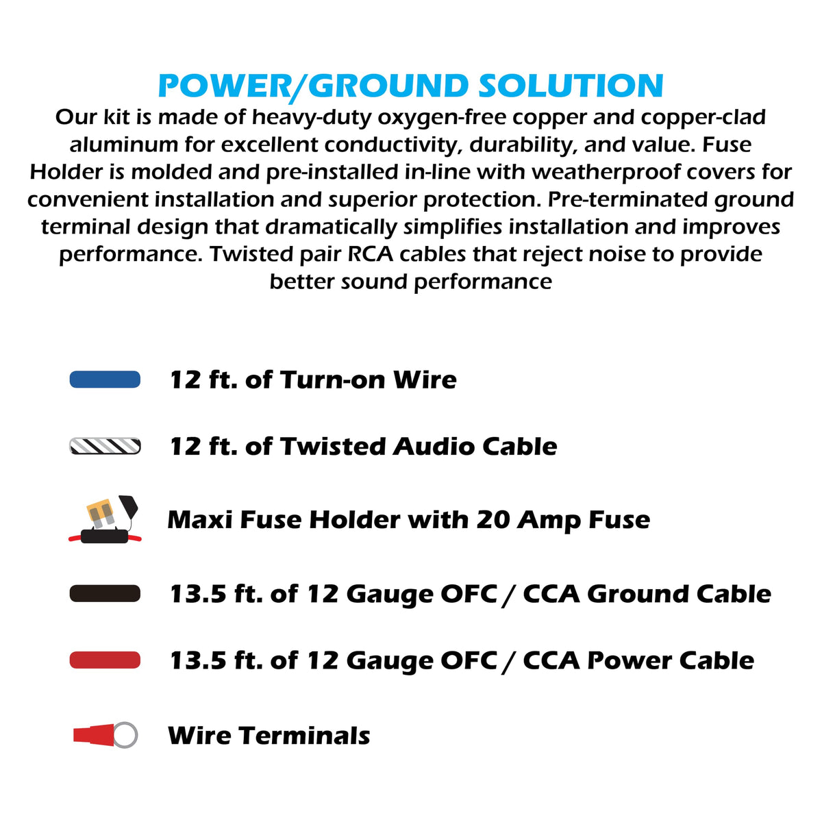 Q: What is included in the Scosche ICAK12 wiring kit?A: The Scosche ICAK12 wiring kit includes a 13.5ft true 12-gauge hybrid OFC/CCA power cable, a 13.5ft hybrid ground cable, a 12ft twisted audio cable, a 12ft remote turn-on wire, an in-line ATC fuse holder with a 20A fuse, and pre-terminated double-strength ground terminals for easy connections.