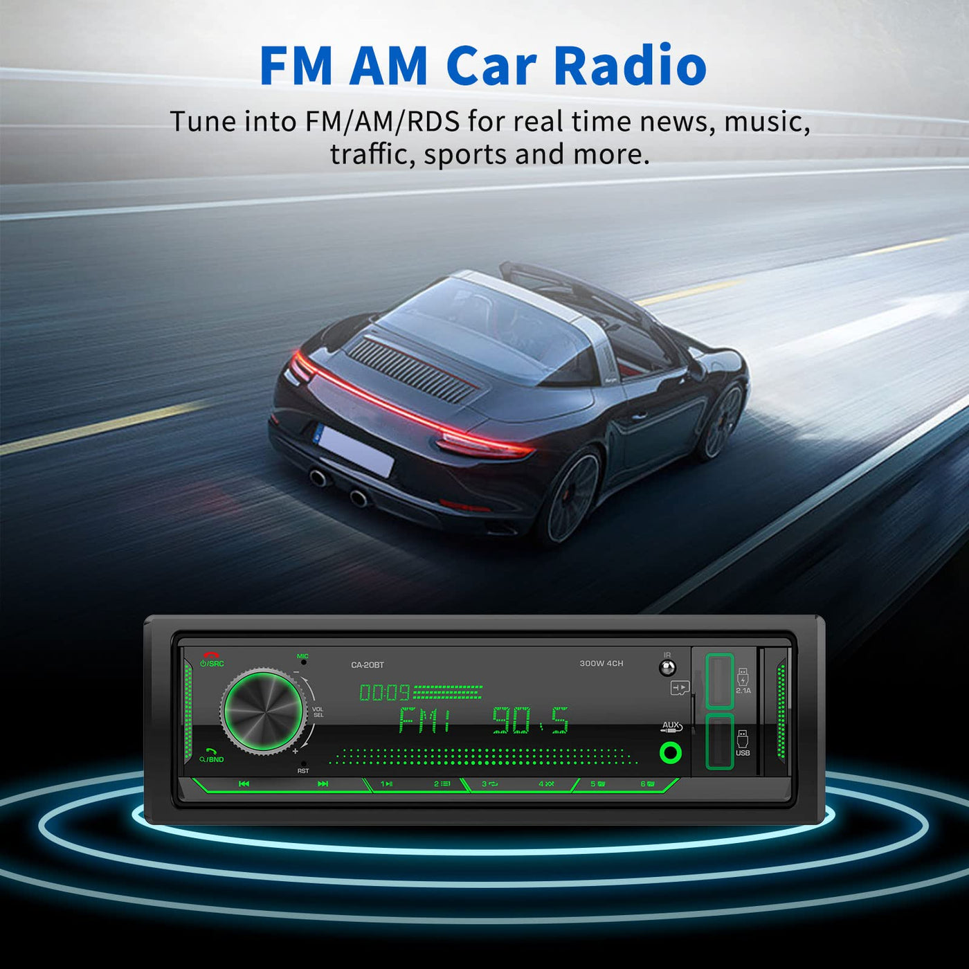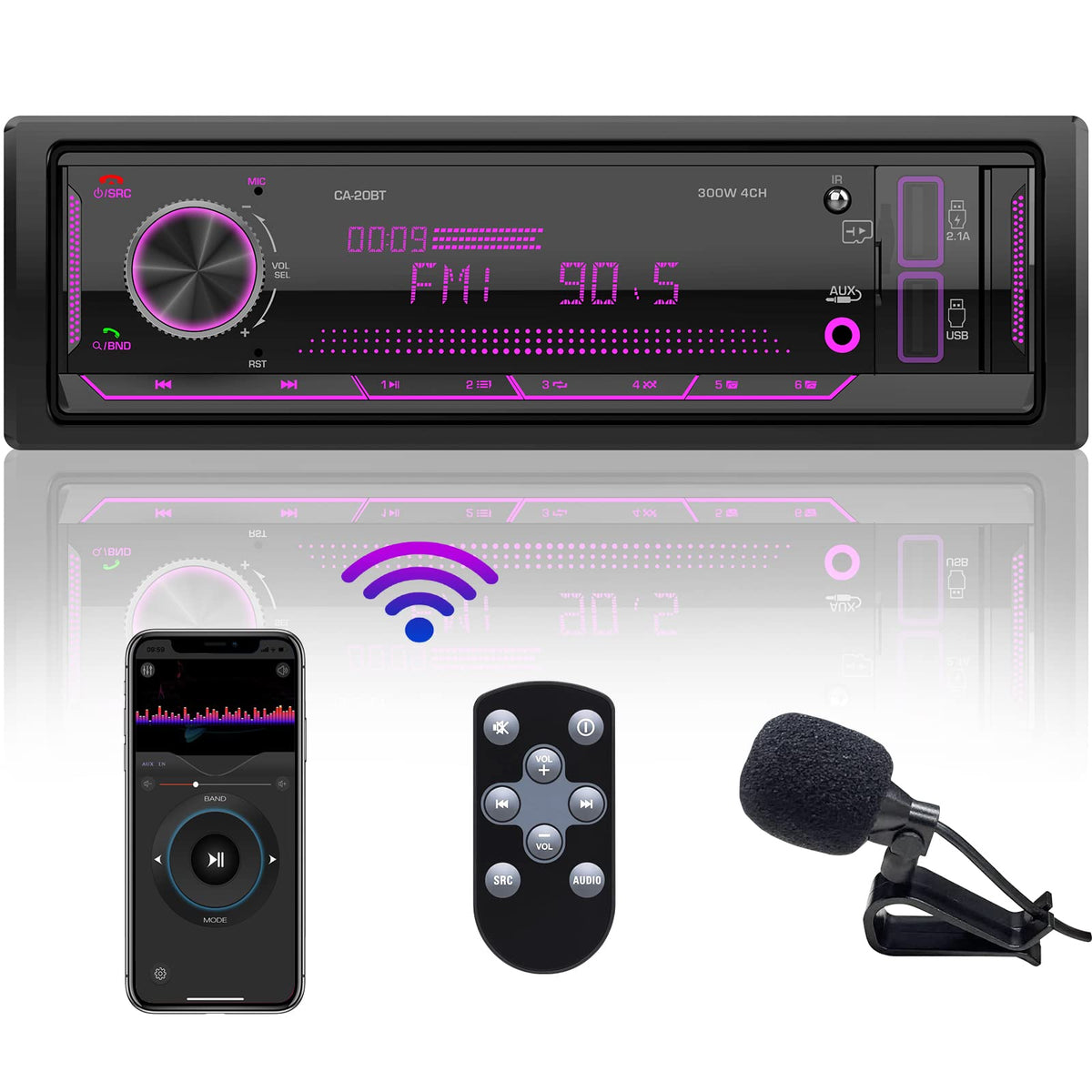 Single Din Multimedia Stereo - Car Bluetooth Audio With Digital Lcd Display | Usb Micro Sd Aux-In | Fm Am Tuner | 2.1A Quick Charge | App&Ir Remote The Marine Bluetooth Radio Has Internal And External Microphons, Which Let You Get Clear Bluetooth Calls Without Distractions. This Single Din Headunit Supports A2Dp Bluetooth Music Playback. You Can Play Your Spotify/Pandora Music. The Car Stereo System Supports Up To 64Gb Usb, 32Gb Micro Sd Card Reader And Auxiliary Audio Input For Audio Streaming. The Bluetooth Boat Audio Is A Built-In Fm/Am Radio With 30 Stations Memory, Tune Into Your Radio Station For Music, Weather Forecast, Traffic Broadcast, And More. This Indash Car Stereo Features Preset Customized Eq (Pop/Jazz/Rock/Classic/Flat), Bass, Treble, Balance, Etc. And Supports 300W Max Audio Output, Let You Enjoy Superior Sound Quality. This Mechless Car Radio Is Equipped With 2.1A Usb Fast Charging Port. You Can Charge Your Phone Anytime, Anywhere. More Features: Id3 Tag Song Readout / Lcd Display / 7-Color Physical Buttons / Power-Off Memory / App&Ir Remote.