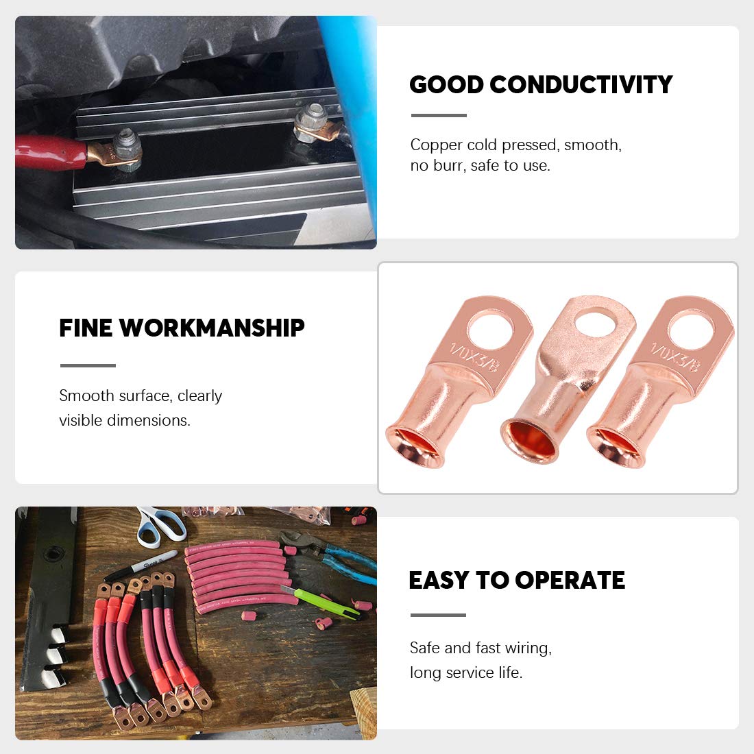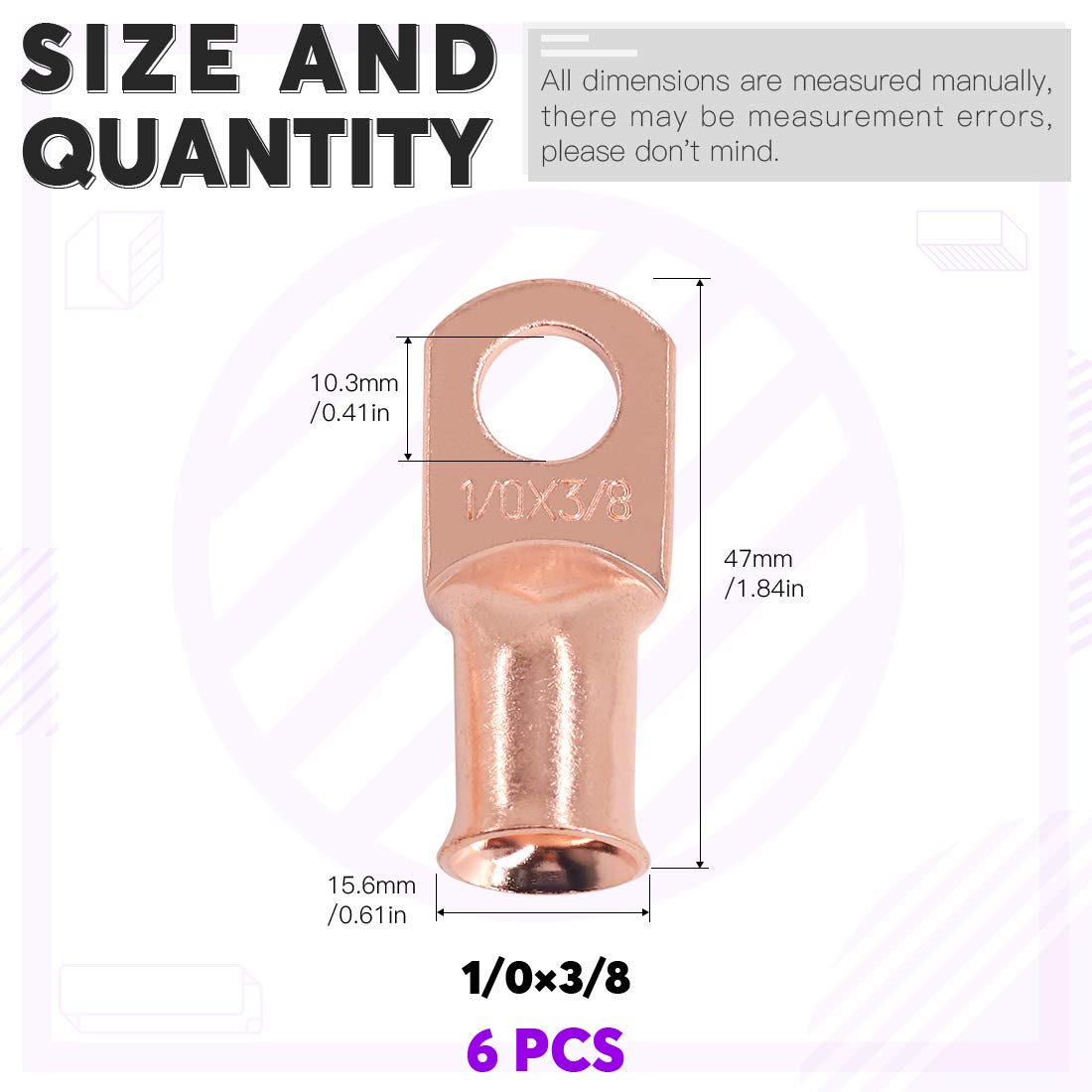 ? Swpeet 6Pcs 1/0 Awg - 3/8'''' (M10) Ul Listed Copper Battery Cable Lugs Wire Lugs, Battery Cable Ends Bare Copper Eyelets, Tubular Ring Battery Cable Ends Ring Terminals ? Why Choose Us? ? 1, Terminal Material:Made From Pure Copper With Good Conductivity. Closed Design Seals Out The Moisture, Ensure Connection Reliability. ? 2, Terminal Types: Closed End Design Seals Out Moisture So Cables Stay Dry And Corrosion Free. ? 3, Heavy Duty Construction Improves High Temperature Durability. Ul Approved, Comply With All Relevant European Standards. ? 5, There Are Different Specifications For You To Choose,It Is More Convenient That Wire Gauge Identification Marked On The Box. ? 6, Easy To Install :Bell Shaped Barrel Enttry For Easy Cable Insertion. ? Specifications: ? Terminal Material: Copper ? Terminal Color: Copper Tone ? Terminal Types: Closed End Design Seals Out ? Heat Shrink Tubing Material: Polyolefin ? Package Included: 6Pcs ----------- 1/0 Awg - 3/8'''' (M10) Ring Terminals