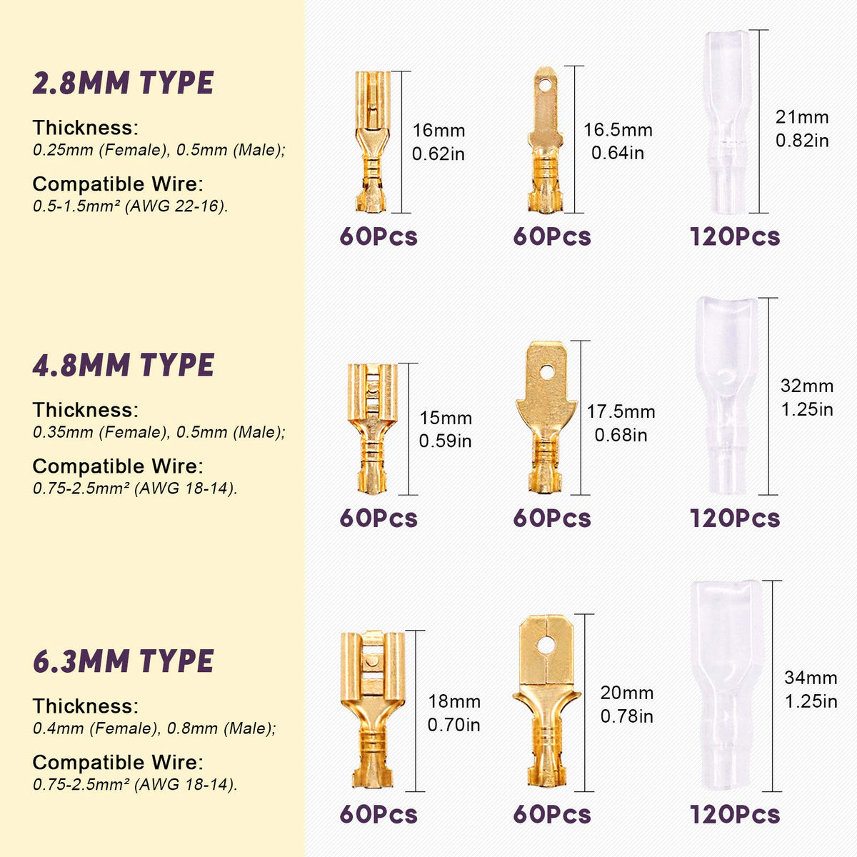? Swpeet 720Pcs Gold 2.8/4.8/6.3Mm Male Female Spade Connectors Wire Crimp Terminal Block With Insulating Sleeve ? Why Choose Us? ? 1,This Is A Male And Female Spade Crimp Terminal Connector Assorted Kit,Are Made Of High Quality Copper, Whose Surfaces Are Plated With Tin Which Ensures Good Conductivity And Corrosion Resistance. ? 2,Suitable For The Connection In Power Cable With Electrical Equipments.Widely Used In The Machinery, Cars, Fixing Domestic Appliances, Computer Or Other Automatic Equipment. ? 3,Male Female Spade Connectors Are Easier To Use And Inspect. Just Crimp And/Or Solder To Your Wires And Cover With A Nice High-Quality Heat-Shrink For A Clean, Solid, And Professional Connection. ?4,The Best Costomer Service.If You Have Any Questions During The Use Of The Product, Please Feel Free To Contact Us, We Will Help You Solve All Your Problems As Soon As Possible. ? Specifications: 6.3 Type: Inner Diameter: 6.3Mm Thickness:0.4Mm(Male) 0.8Mm(Female) Compatible Wire:0.75-2.5Mm(Awg 18-14) 4.8 Type: Inner Diameter: 4.8Mm Thickness:0.35Mm(Male),0.5Mm(Female) Compatible Wire:0.75-2.5Mm2(Awg 18-14) 2.8 Type: Inner Diameter: 2.8Mm Thickness:0.25Mm(Male),0.5Mm(Female) Compatible Wire:0.5-1.5Mm2(Awg 22-16) Package Included: ? 60Pcs X 2.8Mmm Male Spade Crimp Terminal Connector ? 60Pcs X 4.8Mm Male Spade Crimp Terminal Connector ? 60Pcs X 6.3Mm Male Spade Crimp Terminal Connector ? 60Pcs X 2.8Mmm Female Spade Crimp Terminal Connector ? 60Pcs X 4.8Mm Female Spade Crimp Terminal Connector ? 60Pcs X 6.3Mm Female Spade Crimp Terminal Connector ? 120Pcs 2.8Mm Insulating Sleeve ? 120Pcs 4.8Mm Insulating Sleeve ? 120Pcs 6.3Mm Insulating Sleeve ? Intotal 720Pcs