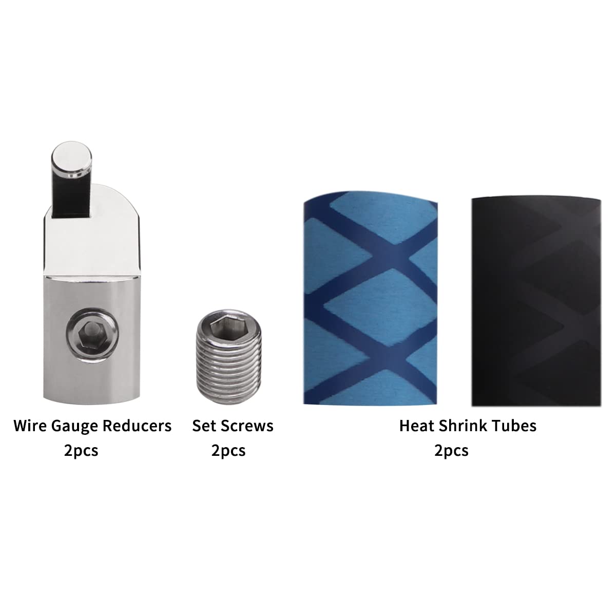 Q: What is included in the package of the URLWALL wire reducers?A: The package includes 2 x 1/0 to 4 Gauge Reducers, 2 x heat shrink tubes for insulation, and 2 x set screws to ensure a tight and secure connection.