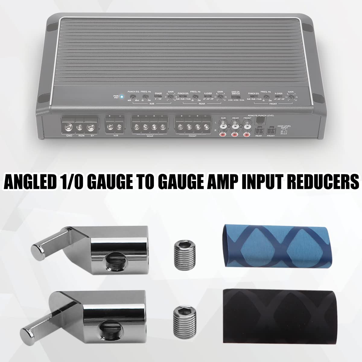 Angled 1/0 To 4 Gauge Wire Reducer Adapters Fit -Will Work With Oversized 1/0 Car Audio Cable, 1/0 Welding Cable, And 2/0 Welding Cable Material Made From Nickel Plated 6061 Aluminum For Added Corrosion Resistance Package: 2 X 1/0 To 4 Gauge Reducers 2 X Heat Shrink Tubes 2 X Set Screws