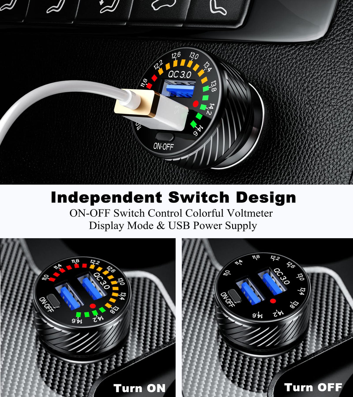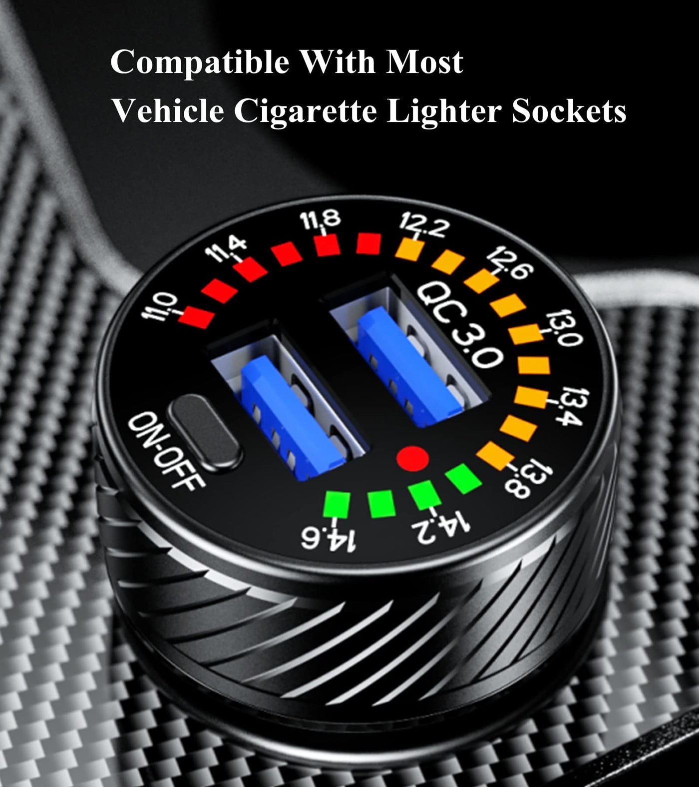 Dual Qc3.0 Ports Fast Usb Car Charger Adapter With On/Off Switch&Colorful Voltmeter