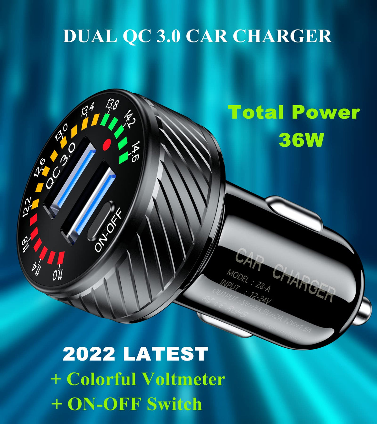 Barcovan Usb Car Phone Charger Adapter, Dual Qc3.0 Port, 36W 3A Fast Charge With Colorful Voltmeter & On/Off Switch
