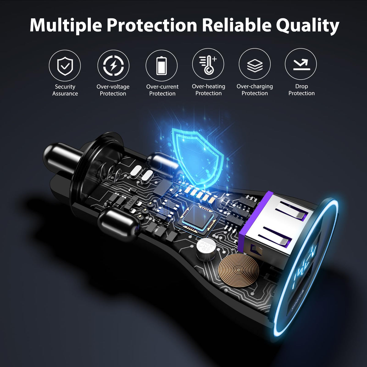 Q: What safety features does this car charger include?A: The charger is equipped with a built-in multi-protect safety system that safeguards your devices from short circuits, overvoltage, overheating, overcharging, and overcurrent, ensuring safe and reliable charging.