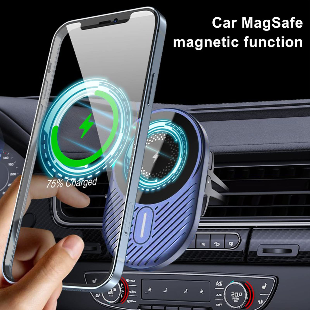 Q: How does the magnetic mounting feature work?A: The charger features strong magnets that allow your iPhone to snap securely into place, making it easy to attach and detach with one hand. This design ensures that your phone remains safely mounted even on bumpy roads.
