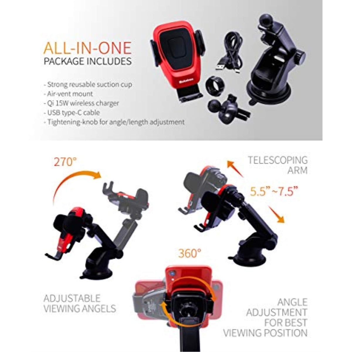 Mobotron Wireless Car Charger Smartphone Mount (Red), Qi 15W Fast Charging