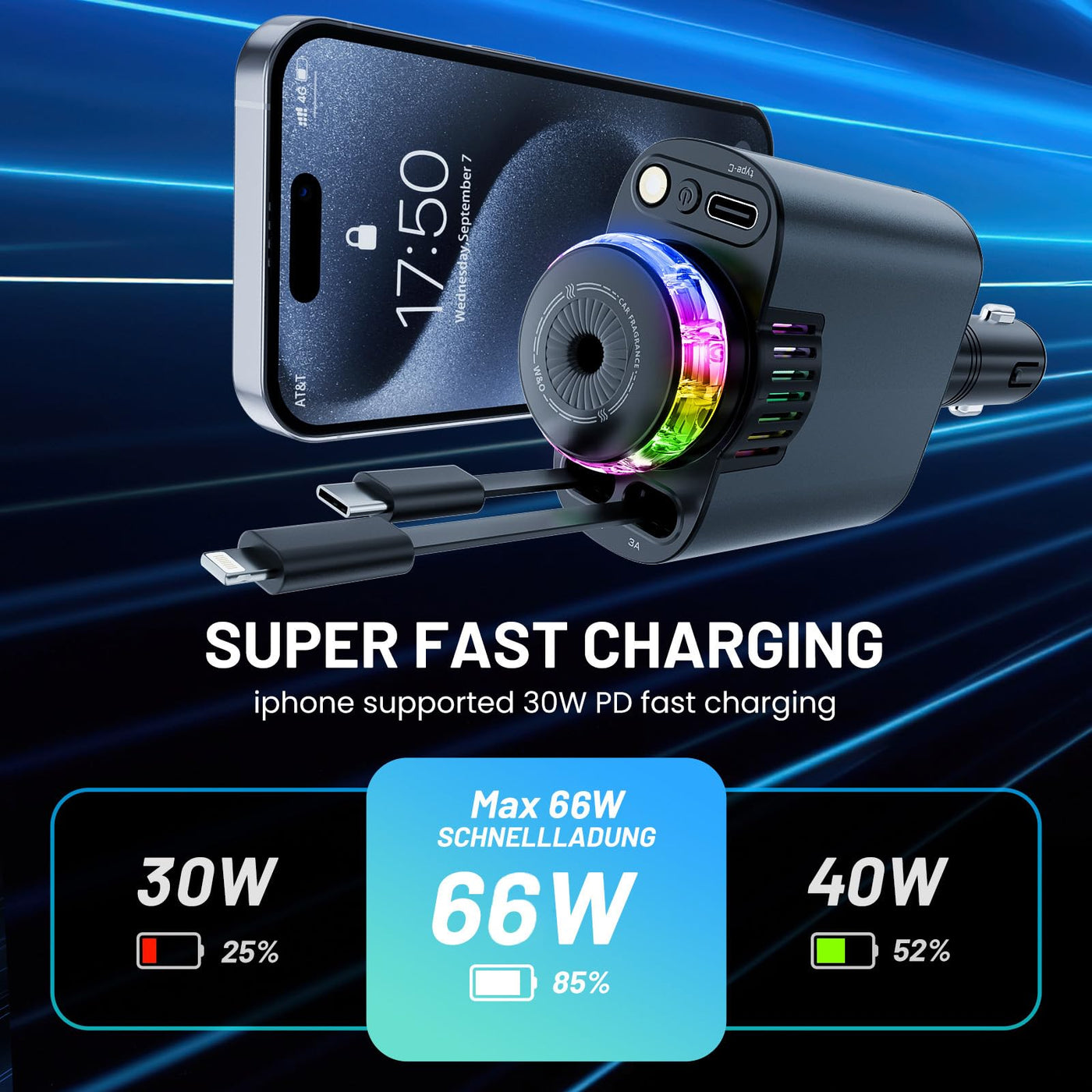 Starlight Retractable Car Charger With Aromatherapy, 5 In 1 Fast Charging 66W Car Phone Charger Adapter, Usb C Car Accessories C
