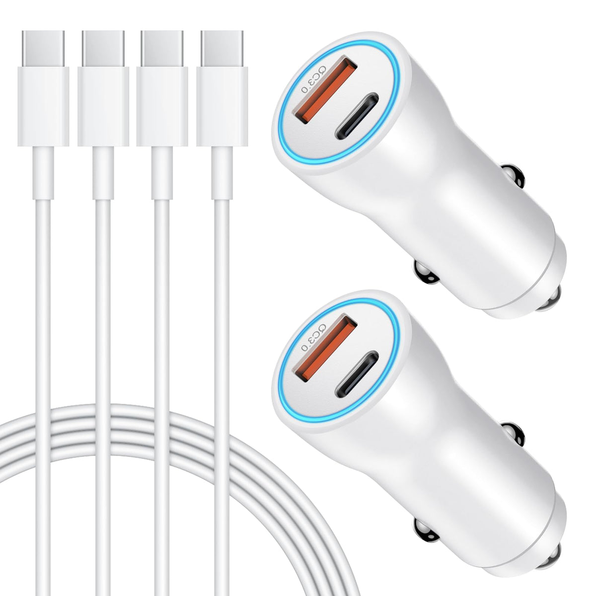 Q: What is included in the package with the car charger?A: The package includes two 25W PD & 18W QC 3.0 Dual-Port Fast Charging Car Charger Adapters and two 3.3 FT USB-C to USB-C Charging Cables, providing everything you need for optimal charging.