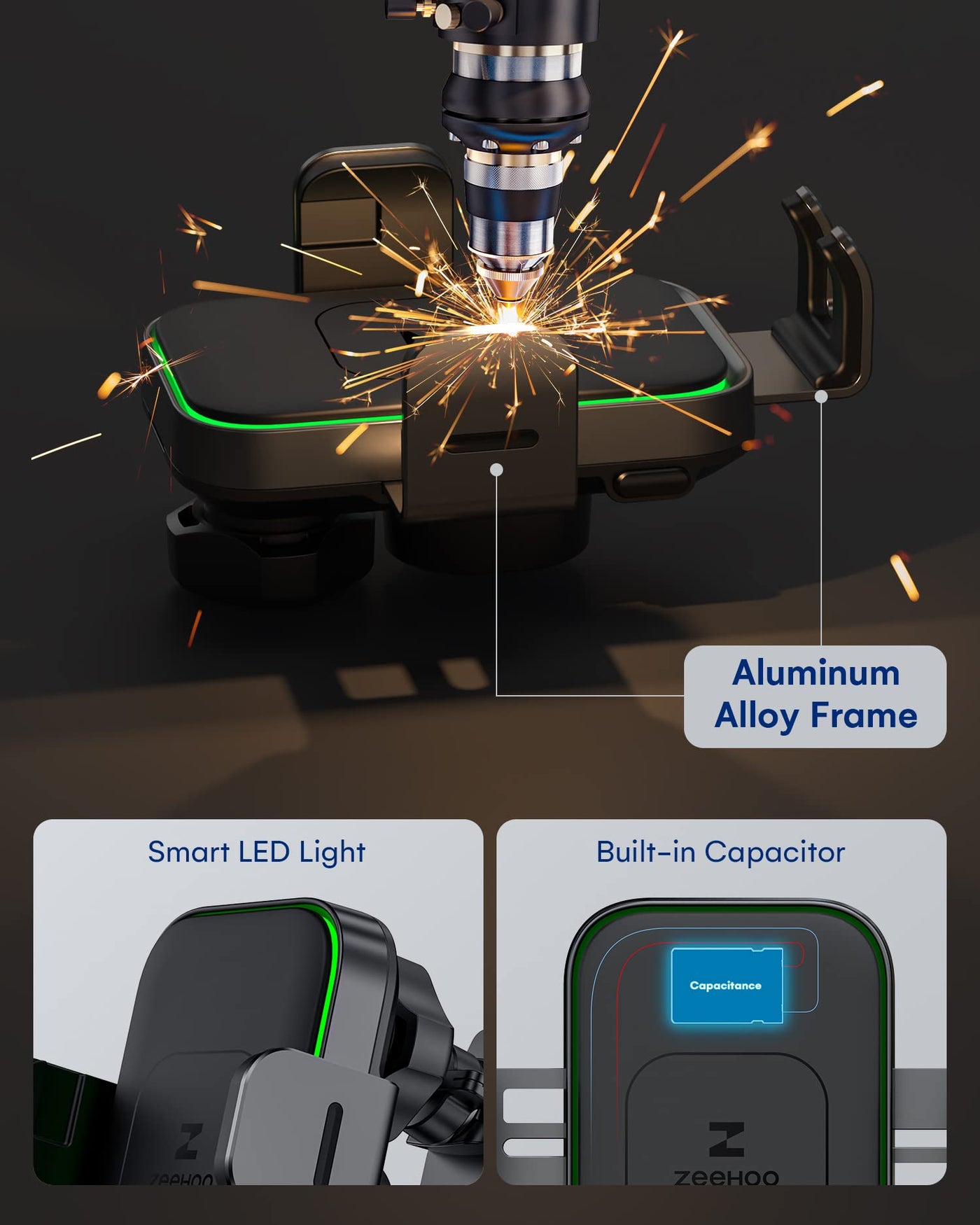 Zeehoo Wireless Car Charger Mount,15W Fast Charging Auto-Clamping Car Mount, Air Vent Phone Holder Compatible With Iphone17 16 15 14 13/12/Mini 11/11 Pro/Pro Max/Xs Max/Xs/Xr/X/8/8+,For Galaxy Z Flip 3 /S22 Ultra / S22+/S22/ S21+/ S20+ Note 20 / Note 10/Note 10 Plus/S10/S9/S8/S7/S6 Edge +/Note 5 * Zeehoo Wireless Car Charger Is Compatible With All Wireless Charging Enabled Phones. * Wireless Charge And Navigate Simultaneously, Not Only Be Used In The Car But Also In The Office And At Home. * No Need To Take Off The Fitted Phone Case Before Wireless Charging, Sensitive Smart Integrated Chipset Can Transmit Charging Power Through The Phone Case Within 3 Mm. (Metal Or Magnetic Phone Case Must Be Taken Off) * Easy To Adjust And Grip All Size Phones, Well Made Of Abs Rubber And Fabric, Make Your Phone On It Stable And Safe. * Built-In Heat Dissipation Vent And Multifunctional Intelligent Technology Are Engineered To Provide Temperature Control, Short Circuit Intervention, Overcharge Intervention, And More. Note: 1. It Only Adapts To A Car Charger Adapter With A Charging Specification Of More Than 5V/2A. 2. For 15W,10W, And 7.5W Fast Charging Modes, Qc 3.0 Car Charger Adapter Is Required As Its Power Source. 3. Phone Case Should Be No Metal Ring, No Metal Plate, And No Credit Card. 4. The Rugged And Uneven Case Is Not Suitable. 5. Support Horizontal Air Vents And Vertical, Round Vents. Package Include: 1X Wireless Car Phone Charger. 1X Air Vent Clip. 1X Suction Cup 1X User Manual 1X Usb Type-C Cable (Length 1M/3.28Ft).
