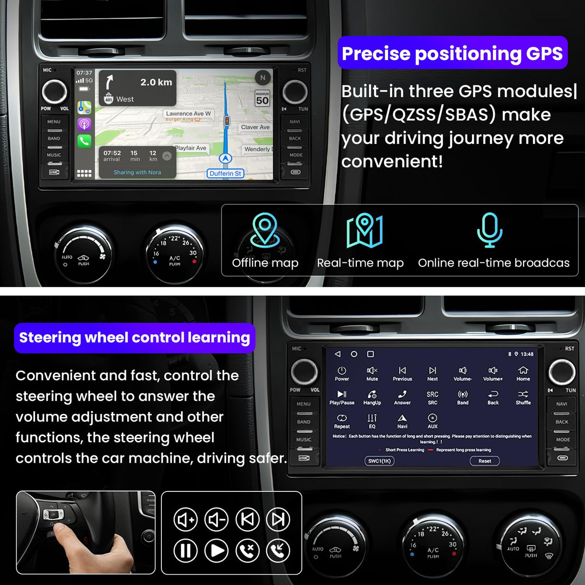 ?Fm Radio&Multiple Media Playback Methods?For Jeep Jk Stable Fm/Rds Radio With 18 Preset Stations, Support Manual And Automatic Station Search, High Quality Digital Stereo (Rds) Fm Tuner, Can Search Radio Stations Automatically/Semi-Automatically And Accurately. You Can Control The Volume Of Each Speaker Before And After And It Has Stereo Eq: Jazz, Rock, Pop, Classic, Etc. You Can Not Only Play Multimedia Outside The Network, But Also Play Music Or Video Online Through The Network | ?Gps Navigation & Steering Wheel Controls?The Jeep Wrangler Radio Comes With North American Maps, Online Map Be Supported, After Connected To Wifi. With The Included Gps Antenna, You Can Easily Connect And Navigate Through Various Destinations.Car Radios Can Install Or Remove Apps From The App Store Just Like A Smartphone, Such As Youtube, Facebook,Maps And More. Support Swc Function,With The Steering Wheel Controls Function, You Can Make Calls, Adjust The Volume Or Change Songs More Safely | ?Bluetooth & Reverse Mode?For Chrysler Wrangler Car Stereo With Bluetooth, Equipped With Built-In Mic And External Mic,Supports Bluetooth Hands-Free Calling, Music Playback And Phone Book Synchronization. If You Think The Called Voice Is Low, You Can Connect The External Microphone In The Package Makes Your Calls More Clear. This Car Radio Come With Backup Camera,When You Put On Reverse Gear, The Screen Of The Jeep Stereo Will Automatically Switch To The Reverse Interface And Safer Parking | ?Wireless Carplay & Android Auto?Android 13 Car Stereo For Jeep Wrangler Jk Equipped With The Latest Technology Of Wired/Wireles Carplay And Android Auto,Simply Connect Your Iphone/Android Phone To The Android Car Radio Via Bluetooth Or Usb Cable. Use Smart Voice Assistant Or Touch The Display, You Can Get Directions, Make Calls, Send And Receive Messages, And Enjoy Music Etc, And Keep You Stay Focused, Keep Connected And Enjoy Entertained While Keeping Your Hands Free For Safe Driving | ?Applicable Car Models?7 Inch Car In-Dash Gps Navigation Head Unit For Jeep Wrangler/Unlimited 2007-2018,For Jeep Compass 2009-2016; For Jeep Patriot 2009-2016;For Jeep Grand Cherokee 2005-2011;For Jeep Liberty 2008-2011;For Jeep Commander 2008-2011;For Chrysler Sebring 2007-2010; For Town&Country 2007-2010;For Dodge Grand Caravan 2011-2014; For Dodge Charger 2008-2010;For Dodge Ram Pickup 1500/2500/3500 2009-2012