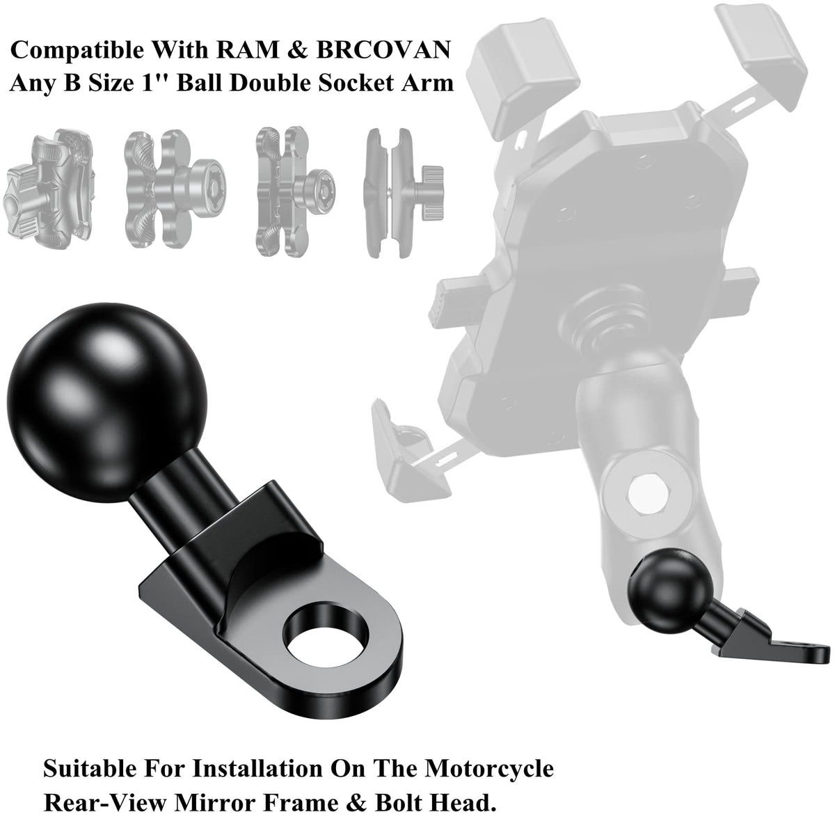 The Aluminum Alloy Mount Base With 1'' Tpu Ball & 10Mm Mounting Hole, Suitable For Mounting To Motorcycle Mirrors Or Bolt Heads. Main Body Made Of 6061-T6 Aluminum Alloy For Durability And Reliability In The Most Demanding Environments. Cnc Integral Molding, Solid Structure. Anodized Surface Treatment, Smooth Surface, Durable. Tpu Over-Molded Ball Head, Non-Slip And Wear-Resistant.