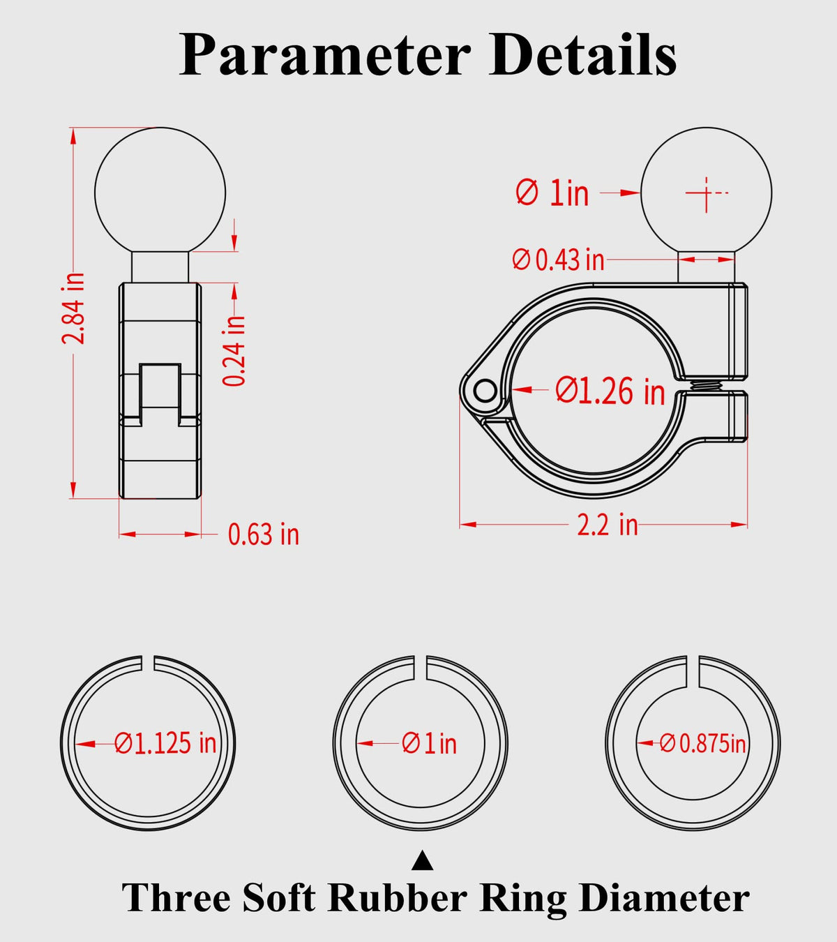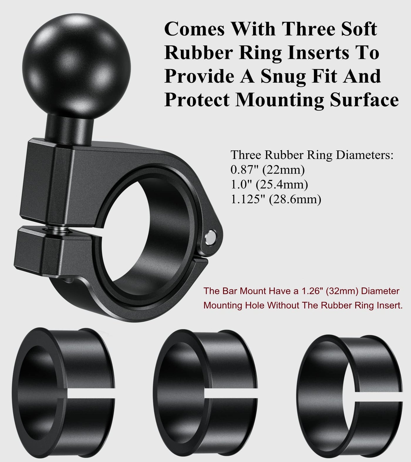 The Aluminum Alloy Handlebar Clamp Mount Base With 1'' Tpu Ball For Rails 0.875'' / 1'' / 1.125'' / 1.26'' In Diameter, Compatible With Ram Mounts B Size Ball Double Socket Arm.