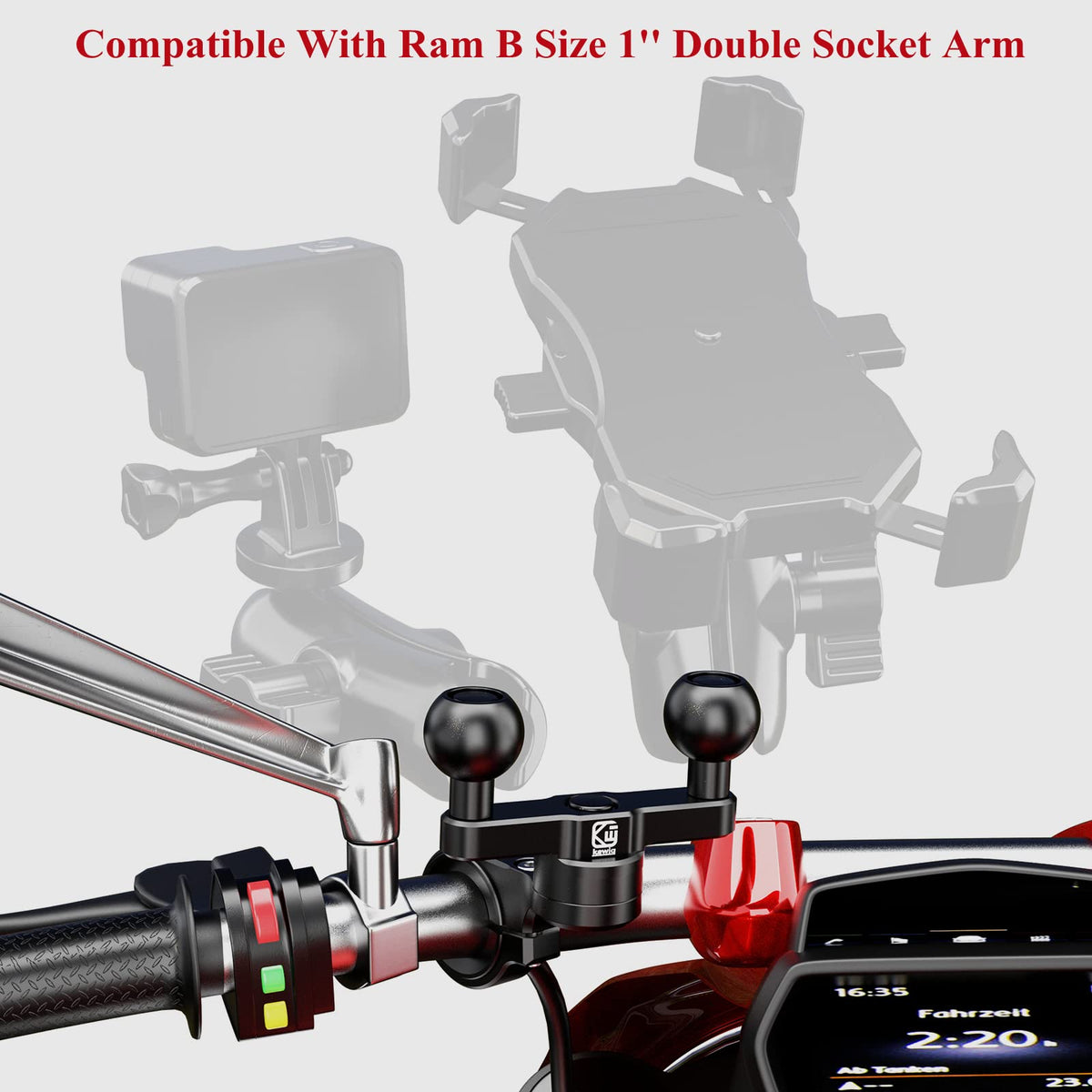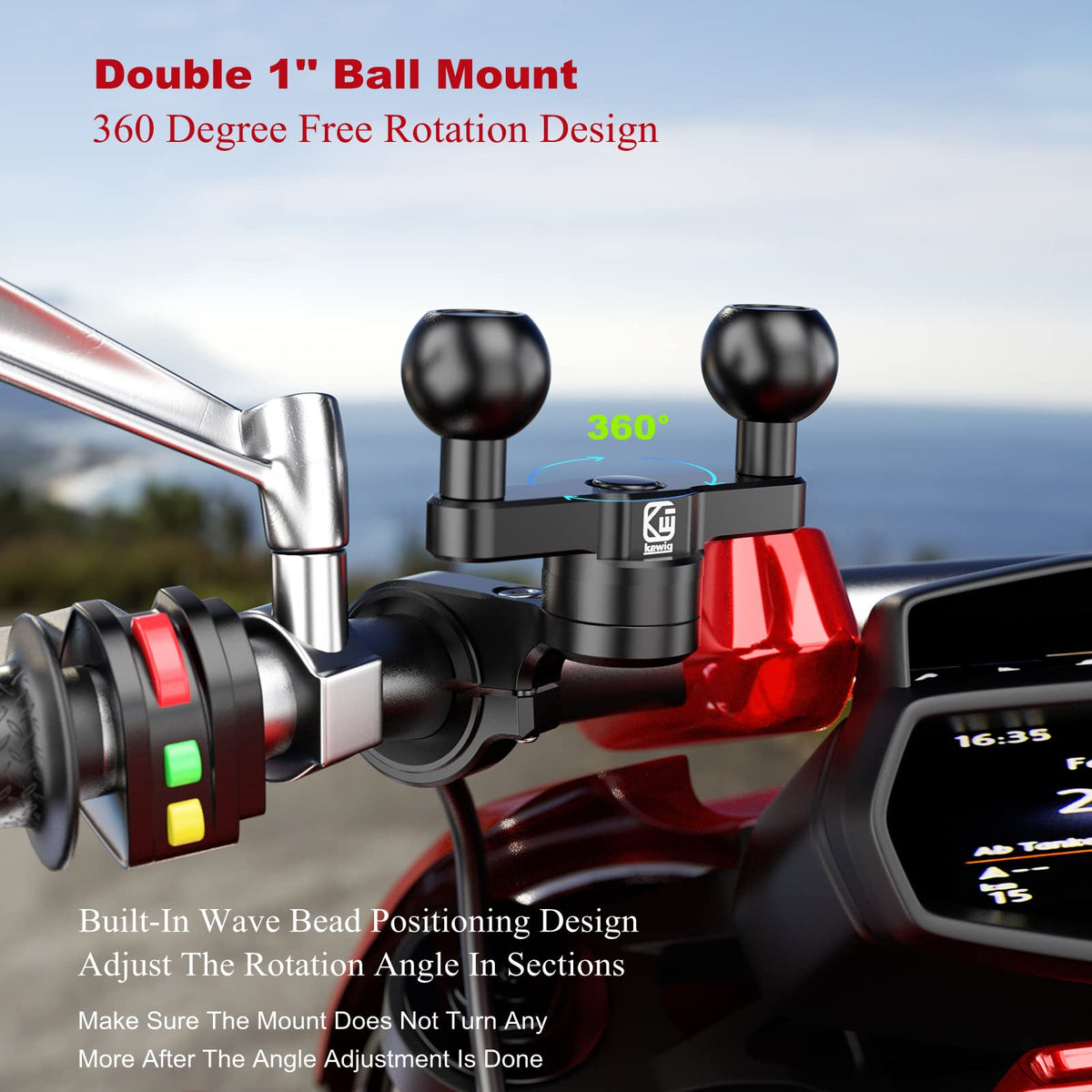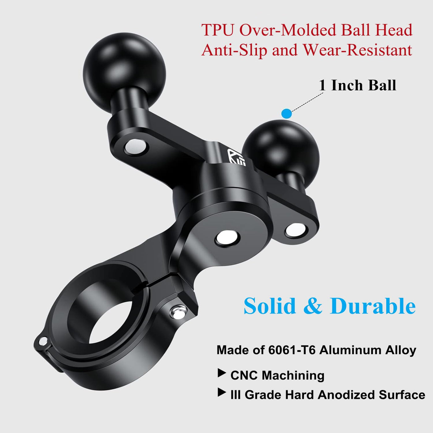 The Aluminum Alloy Handlebar Clamp Mount Base With Double 1'' Tpu Ball For Round Rails Diameter 0.5'' 0.87'' 1'' 1.26'', Compatible With Ram Mounts B Size 1 Inch Ball Double Socket Arm. Main Body Made Of 6061-T6 Aluminum Alloy For Durability And Reliability In The Most Demanding Environments. Cnc Integrated Molding, Smooth Surface And Solid Body. Tpu Over-Molding Ball Head, With Anti-Slip Performance. 360 Degree Free Rotation Design.