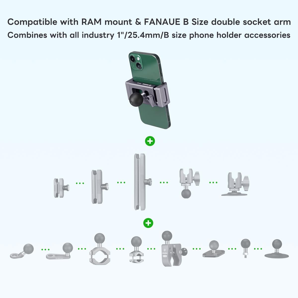 Fanaue Aluminum Phone Holder With 1'' Ball Head Adapter Compatible With Ram Mounts B Size Double Socket Arm & Bike Motorcycle Ph