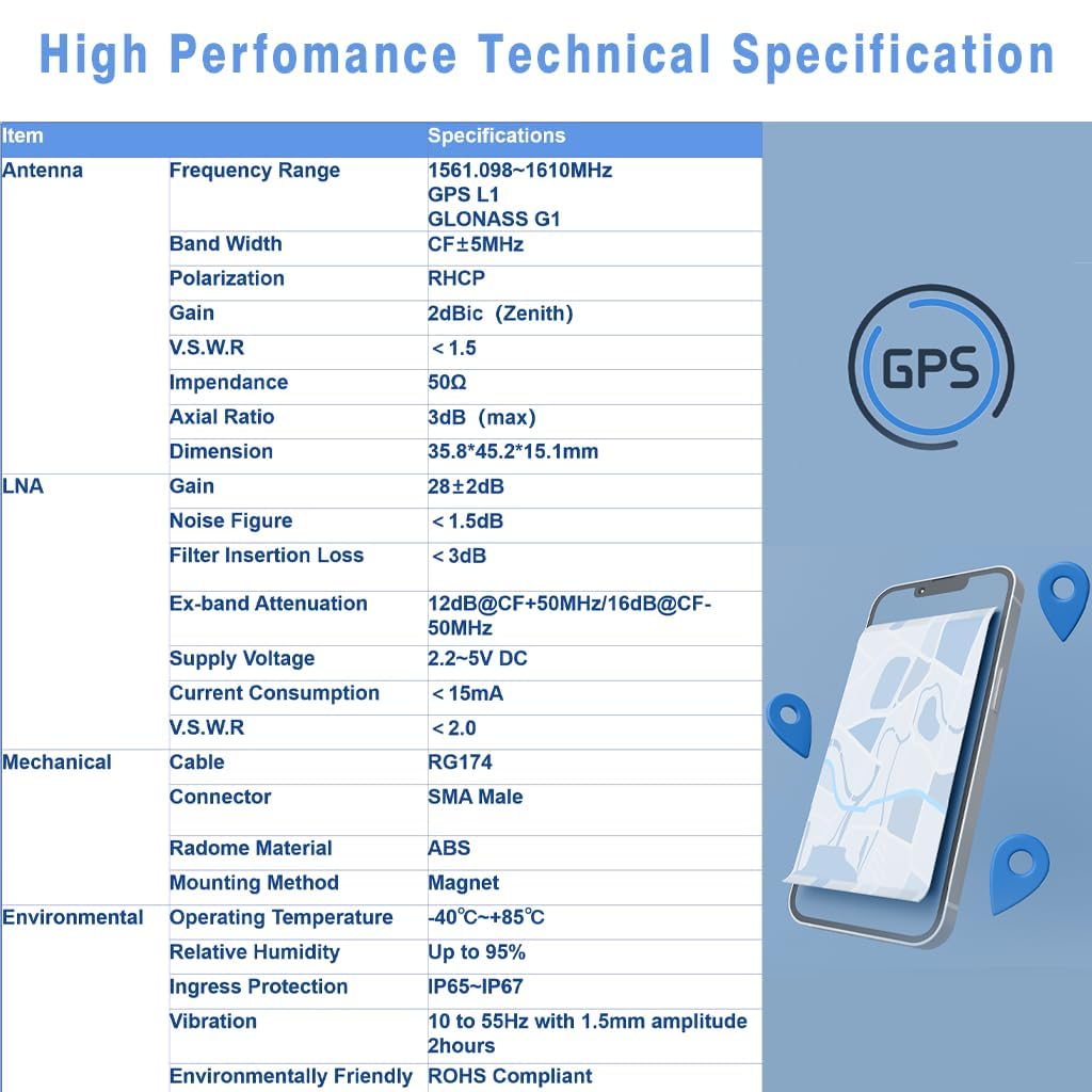 Q: What is the frequency range of the GNSS Antenna?A: The GNSS Antenna operates within the frequency range of 1561.098 to 1610 MHz, making it ideal for GPS signal boosting for various devices.