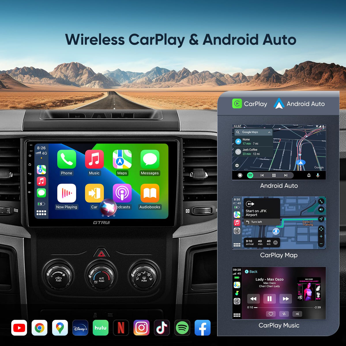 Gtrui 9 Inch Qled Touch Screen 4+64Gb Android Car Stereo For Dodge Ram 1500 2500 3500 2013 2018,Wireless Carplay Auto 5G Wifi Bl