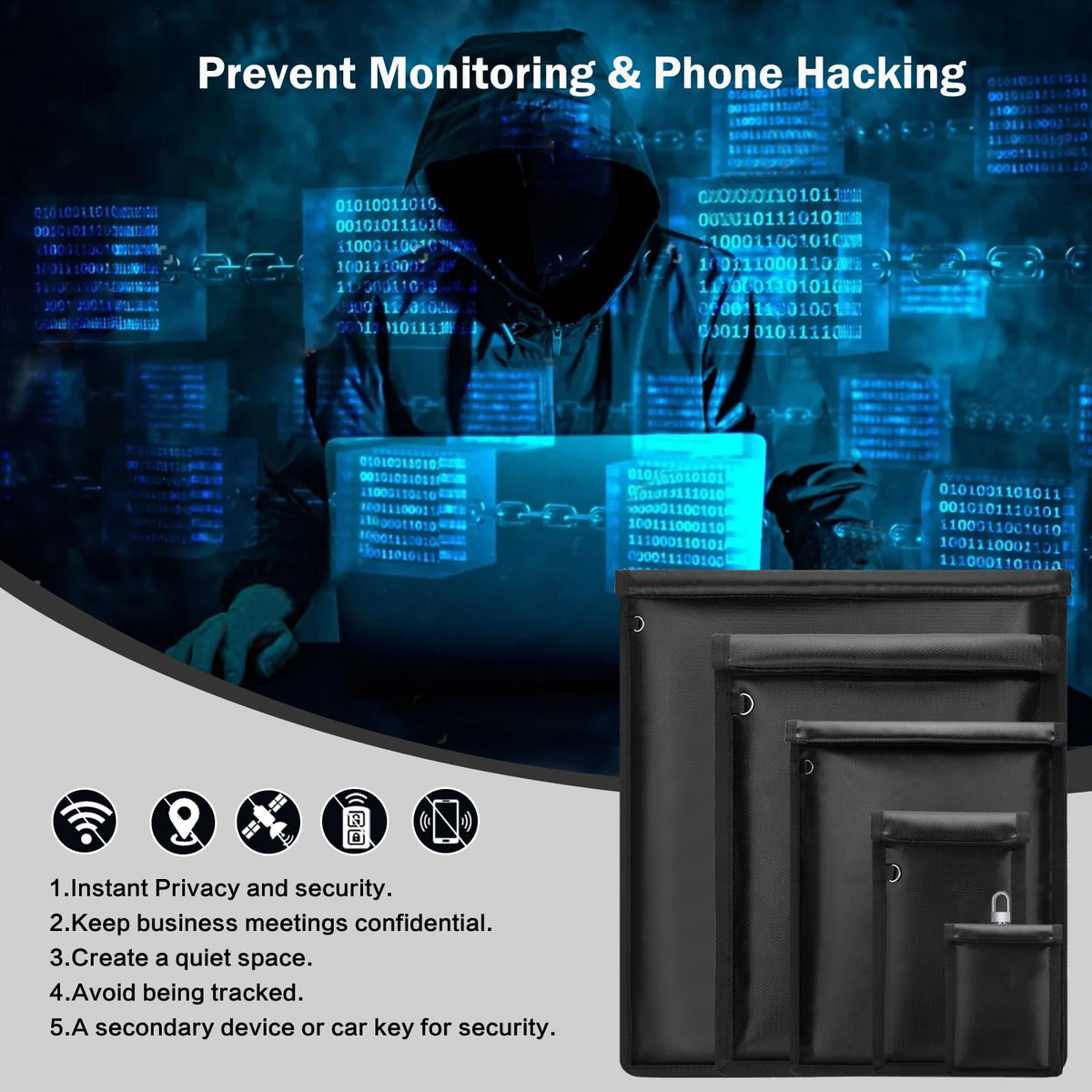 Kiphca 5 Pack Faraday Bag, Faraday Bags For Phones, Faraday Key Fob Protector, Faraday Cage For Anti-Theft Tracking Hacking Spying & Signal Blocking, Waterproof & Fireproof, Faraday Bag For Laptops & Car Keys & Cards Fraud(Black)