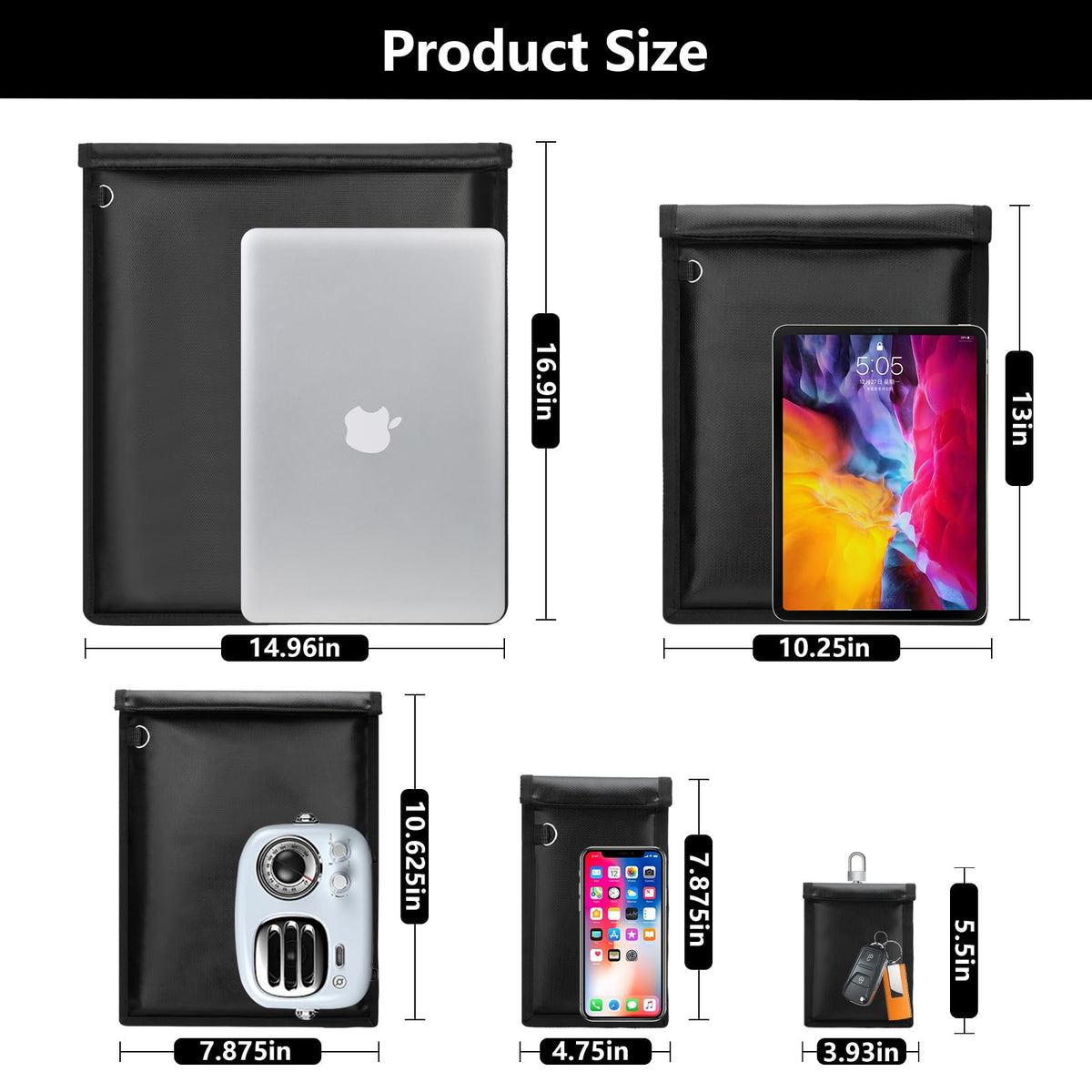 Q: What sizes do the KIPHCA Faraday bags come in?A: The KIPHCA 5 Pack includes various sizes to meet different needs: a laptop bag (16.9''x14.96''), a tablet bag (12.99''x10.23''), a radio bag (10.63''x7.87''), a cell phone bag (7.87''x4.72''), and a key tablet bag (5.5''x3.93'').