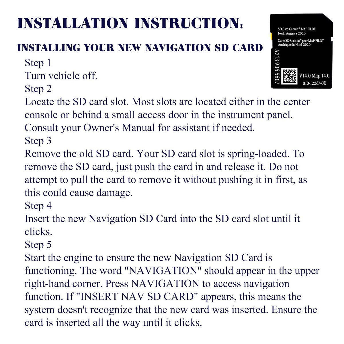 Q: What should I do if the SD card doesn't fit my vehicle?A: If you are unsure whether this SD card will fit your vehicle, we recommend contacting us directly via Amazon for assistance. We are committed to helping you find the right product for your navigation needs.