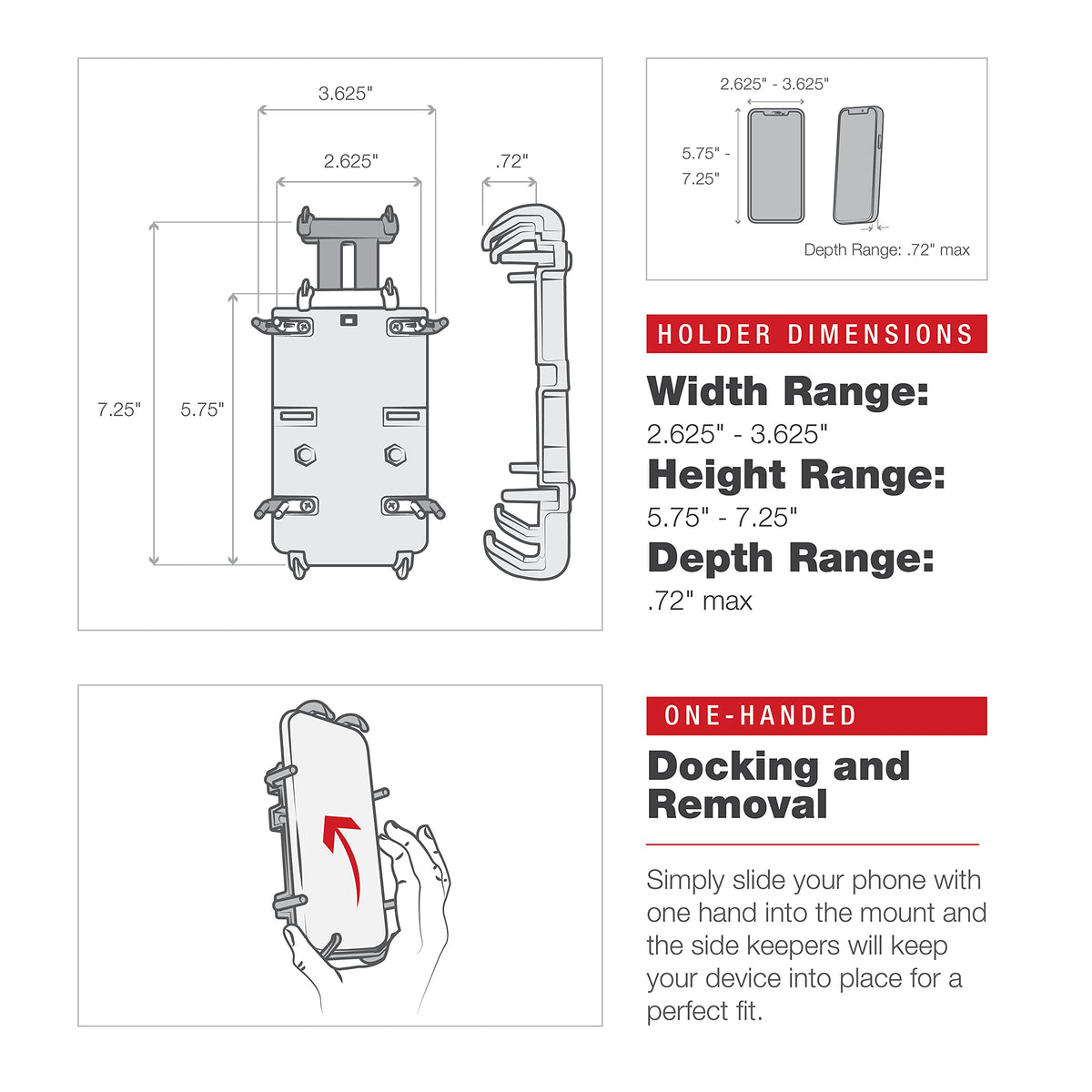 Q: What types of phones are compatible with the RAM MOUNTS Quick-Grip Large Phone Mount?A: The RAM MOUNTS Quick-Grip Large Phone Mount is designed to securely fit a variety of phone sizes, thanks to its spring-loaded holder and adjustable side supports. It can accommodate most smartphones, ensuring a snug fit while allowing for easy insertion and removal.