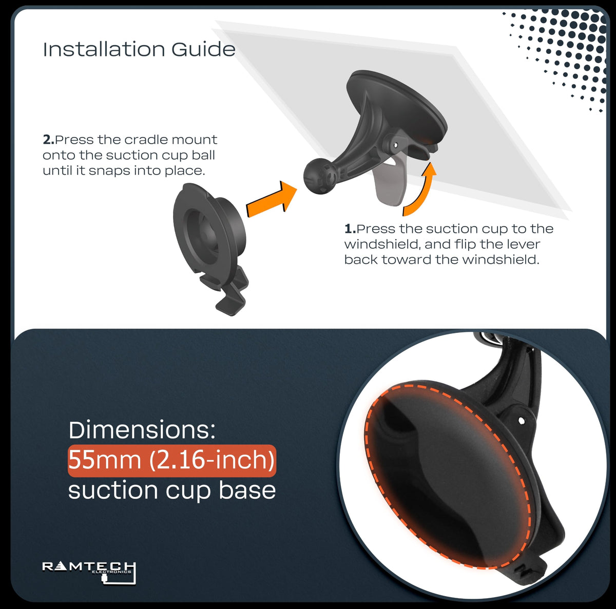 Q: What materials are used in the construction of the suction cup mount?A: The Ramtech suction cup mount is made from durable Acrylonitrile Butadiene Styrene (ABS), ensuring robust performance and longevity while securely holding your GPS device during travel.