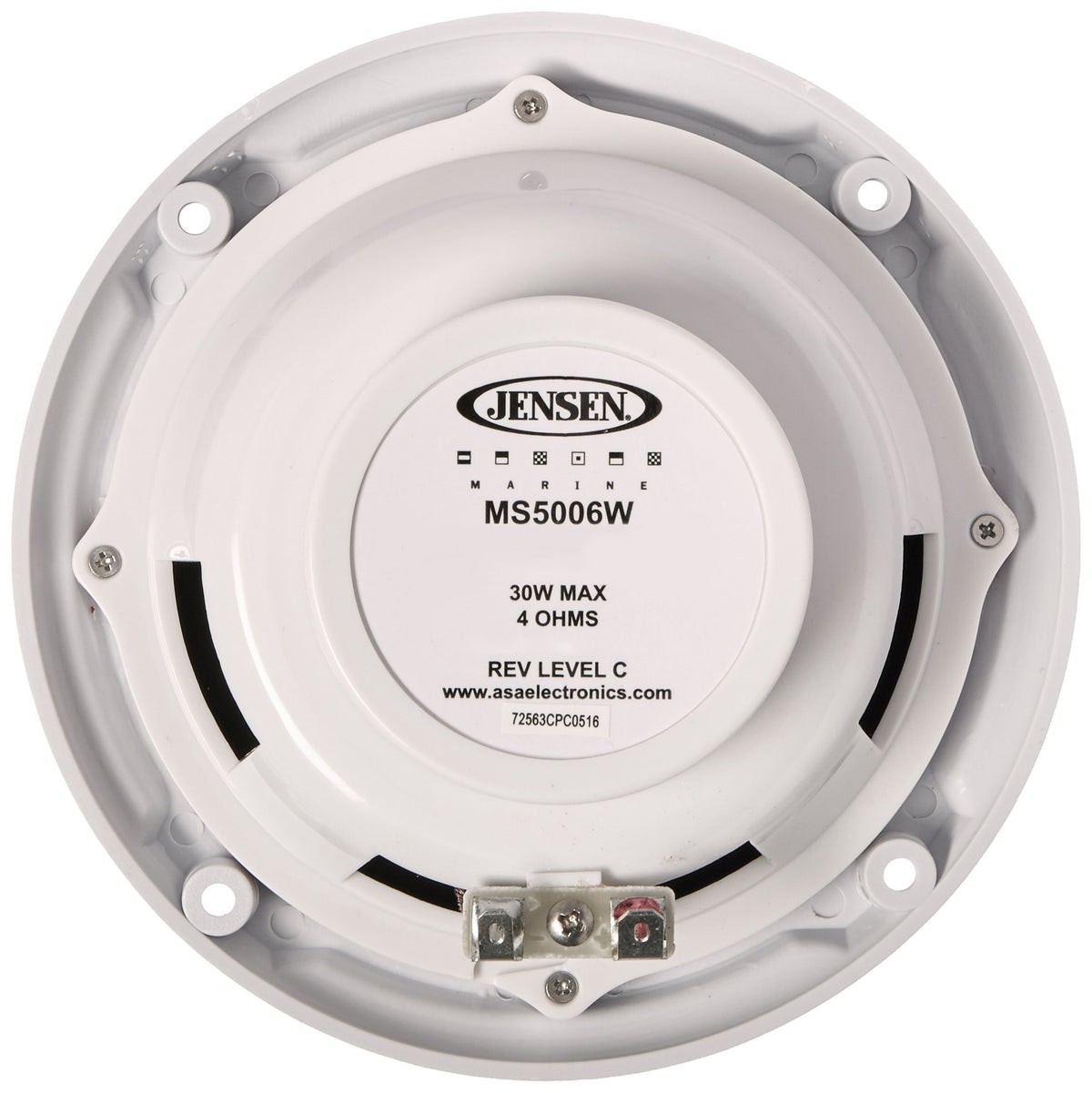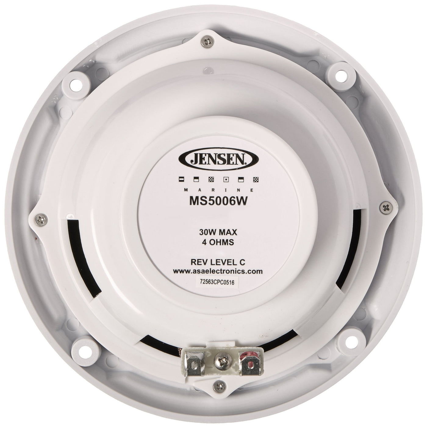 Jensen Ms5006Wr Dual Cone Waterproof 525 Speaker, White, 30 Watts Max Power Handling, Sensitivity 86Db, Frequency Response 79Hz-20Khz, Nominal Impedance 4 Ohms, 15 Mounting Depth, Sold In Pairs This Waterproof Marine Speaker Is Specifically Designed For Outdoor Entertainment This Speaker Is Completely Waterproof And Engineered With Uv Resistant Materials To Withstand The Outdoor Elements Key Features 525 Dual Cone Waterproof Speaker 30 Watts Max Power Handling Astm B117 Salt Spray Exposure Standard Compliant Astm D4329 Uv Exposure Standard Compliant Sold In Pairs Specifications Speaker Color: White Sold As: Individual Max Power Handling: 30 Watts Magnet: 29 Oz Sensitivity @ 1W1 Meter: 86 Db Frequency Response: 79Hz-20Khz Nominal Impedance: 4 Ohms Grille Diameter: 5-1516 Mounting Hole Diameter: 4-38 Mounting Depth: 1-12 Watertight Standard Compliant: Yes Tweeter Type: Whizzer Tweeter Material: Mylar Polypropylene Woofer Cone: Yes Fs: 67Hz Vas: 9711 Ltr Qts: 1197 Qes: 1654 Xmas: 06 Mm Weight: 1 Lbs