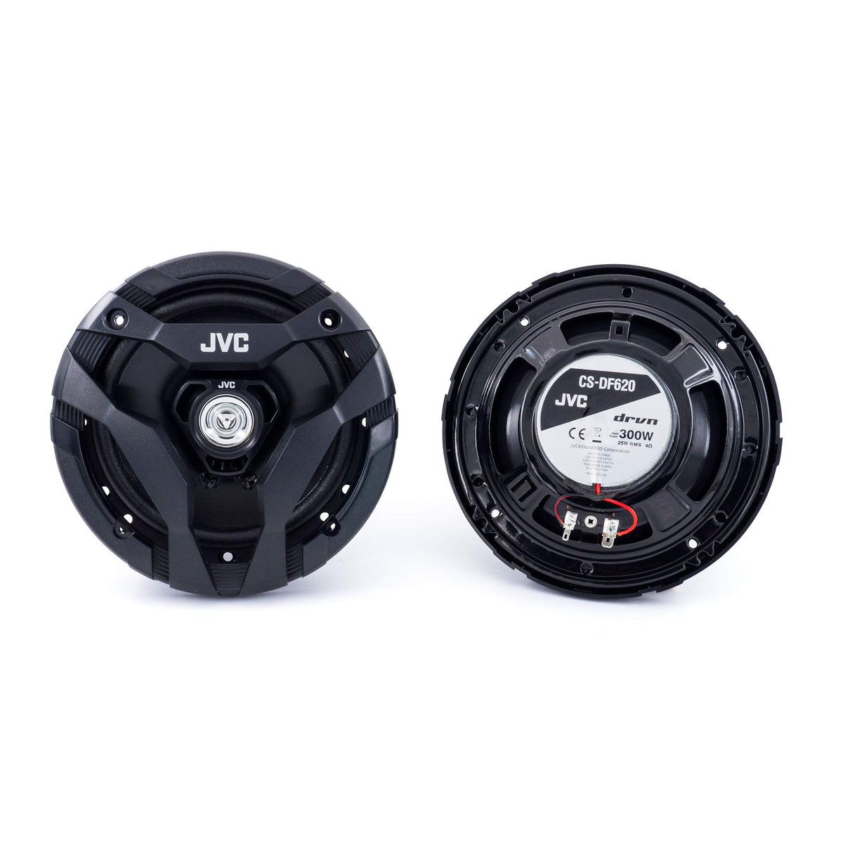 The Jvc Mobile Drvn Df Series Speakers May Be Entry Class, But They Have Powerful Sound Reproduction, Deep Bass, And A Tough-Looking Design. This Pair Of 6-1/2 In. 2-Way Coaxial Speakers Use A Rubber Coated Cloth For The Surround For Increased Mobility, High Efficiency, And Improved Follow-Up To Audio Signals. Plus The Tweeters Do Not Protrude So There'S No Interference With Factory Grilles While The Reduced-Depth Baskets Will Fit Virtually Any Application. These Speakers Have An Rms Rating Of 25 Watts With A Max Power Rating Of 300 Watts. 6.5 In. 300 Watts Max, 25 Watts Rms Frequency Response: 70 Hz To 19 Khz 4 Ohms Impedance 1 In. Balanced Dome Tweeter Hybrid Rubber-Coated Cloth Has Increased Mobility For High Efficiency And Improved Follow-Up To Audio Signals 65 Mm Ferrite Magnet Short Height With Zero Tweeter Protrusion Provides No Interference With Factory Grilles Reduced-Depth Baskets Fit Virtually Any Application Mounting Depth 1-13/16 In. Includes 2 Grilles, Two 12 In. Lengths Of Speaker Wire With Female Quick Slides On 1 End And Bare Wire On The Other, Eight 1 In. Screws, 8 Speed Clips, Safety Instructions, And Template And Specifications On Packaging Pair