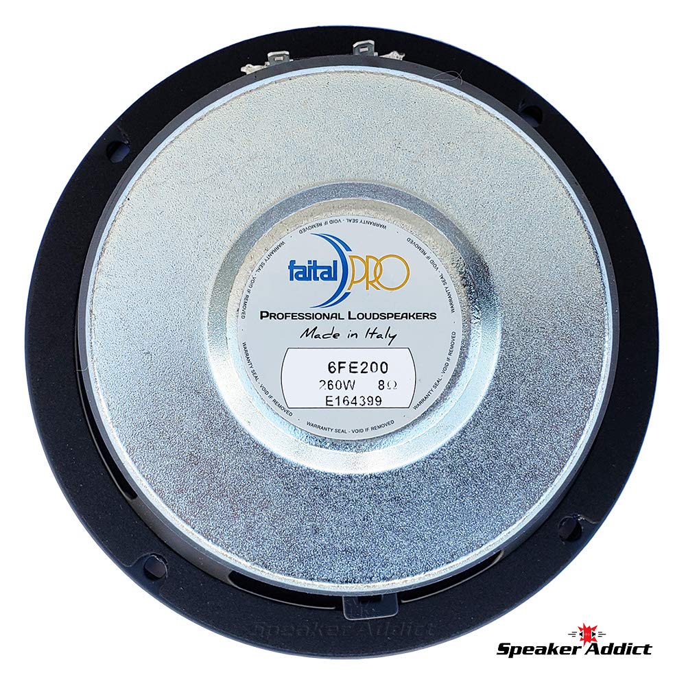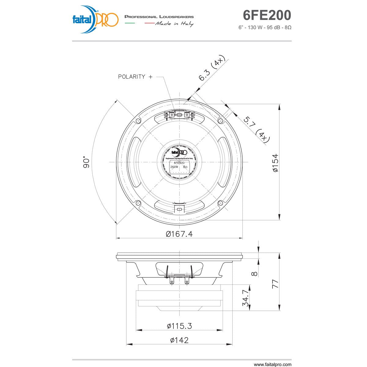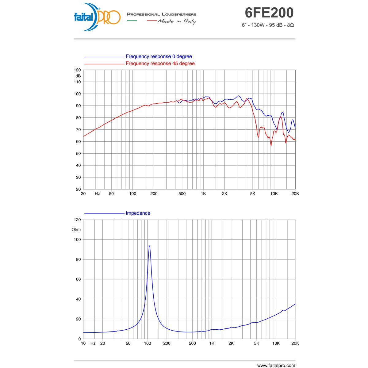 Specifications. Brand:Faital Pro; Model:6Fe200; Nominal Diameter:6.5'; Nominal Impedance:8Ohm; Rms Power:130 W; Peak Power (Watts):260 W; Sensitivity (Db):95 Db; Max Excursion(Xdam)(Xlim):10.4 Mm; Max Linear Excursion (Xmax):4.67 Mm; Usable Frequency Range (Hz):85-6K Hz; Surround Shape:M-Roll; Basket / Frame Material:Steel; Spider Detail/Material:1X Constant Height Waves; Voice Coil Diameter:1.46'; Voice Coil Former:Kapton; Voice Coil Wire Material:Aluminum; Voice Coil Winding Depth:12 Mm ; Voice Coil Gap Height:8 Mm ; Demodulating Ring:No; Magnet Material:Ferrite . Parameters. Compliance Equivalent Volume (Vas):0.11 Ft3; Total Q (Qts):0.67; Mechanical Q (Qms):6.2; Electromagnetic Q (Qes):0.75; Minimum Impedance (Zmin):6.8Ohm; Dc Resistance (Re):5.9 Ohm; Mechanical Resistance (Rms):3.09 Lbs/Sec; Surface Area Of Cone (Sd):18.29 In2; Voice Coil Inductance (Le):0.4 Mh; Flux Density:1 T; Bl Product(Bl):8.2 T-M; Moving Mass Of Diaphragm (Mmd):11.1 G; Moving Mass(Mms):11.5 G; Reference Efficiency (No):0.0067; Mechanical Compliance (Cms):0.15 Mm/N; Ebp:160 Hz; Driver Displacement:27 In3. Mounting And Shipping Information. Overall Diameter:6.59'; Baffle Hole Diameter:5.67'; Bolt Circle Diameter:6.06'; Flange And Gasket Thickness:0.31'; Depth:3.03'; Net Weight(Lb):4.4