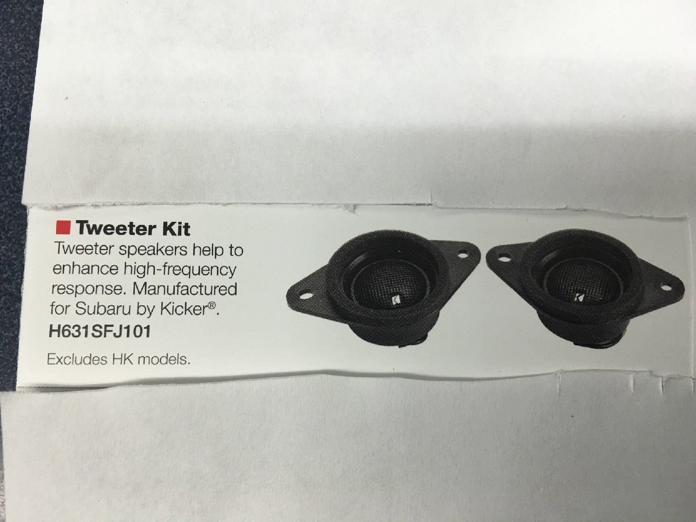 Need A Genuine Subaru Tweeter Speaker Kit For Your Subaru? Your Package Will Include Oem Sealed Items. The Package Will Include Tweeter Kit H631Sfj101 X1. The Genuine Subaru Tweeter Speakers By Kicker Help To Enhance Higher-Frequency Response For Your Listening Enjoyment. Each Kit Includes Two Speakers And Everything That You Will Need To Install Them. Manufacturer For Subaru By Kicker. Special Speakers Enhance High-Frequency Audio Response As Well As Improve Stero Imaging Beyond The Stock Tweeter Speaker. Don'T Settle For Aftermarket Components Of Questionable Quality And Always Insist On Genuine Subaru Replacements. Fits: 2014-2018 Forester, 2012-2014 Impreza (Non Wrx Non Sti), 2015-2016 Impreza, 2015-2021 Wrx Sti, 2013-2017 Crosstrek