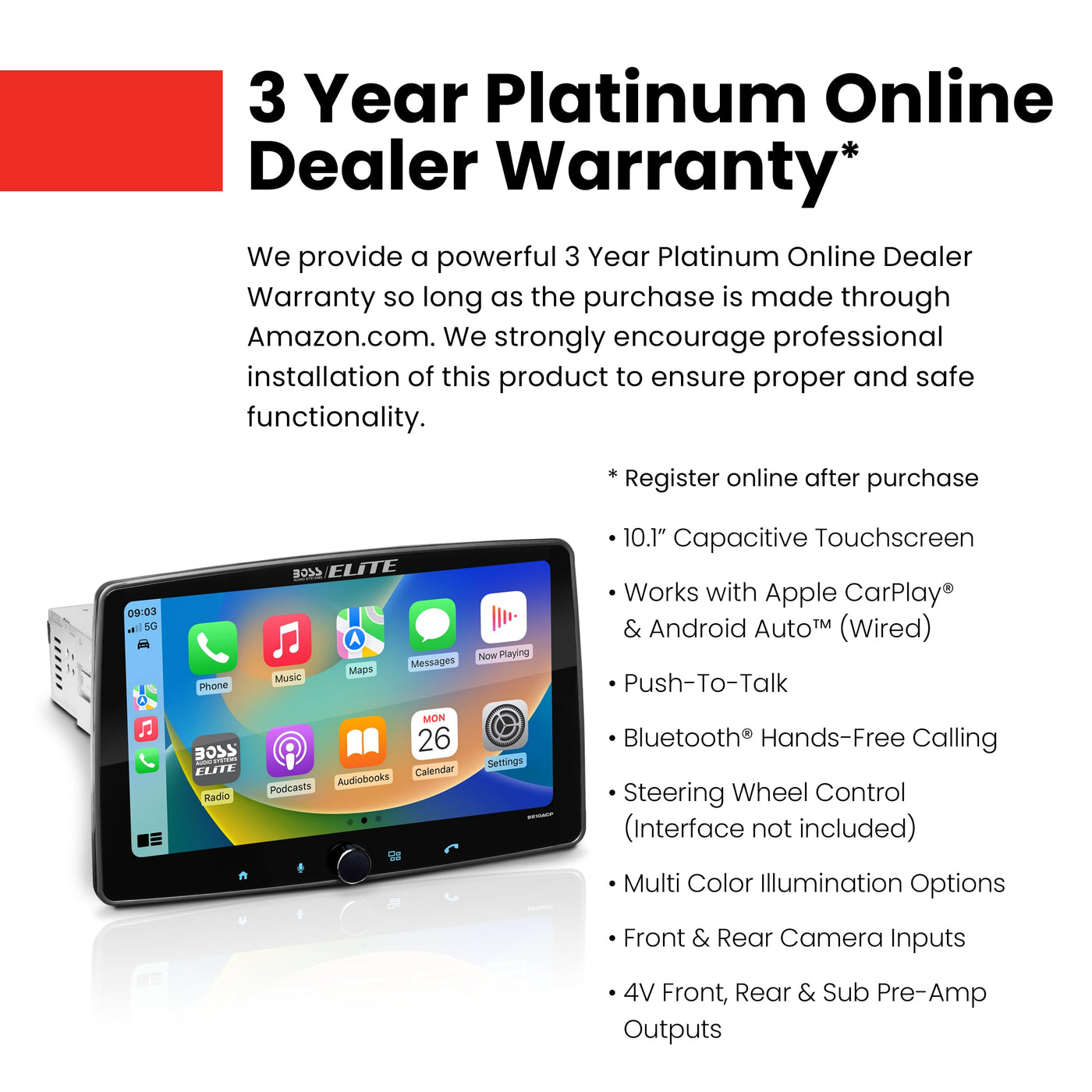 Boss Audio Systems Elite Be10Acp Car Stereo System, Apple Carplay, Android Auto, 10.1 Inch Single Din, Touchscreen, Double Din Conversion Brackets, Bluetooth Head Unit, No Cd Player