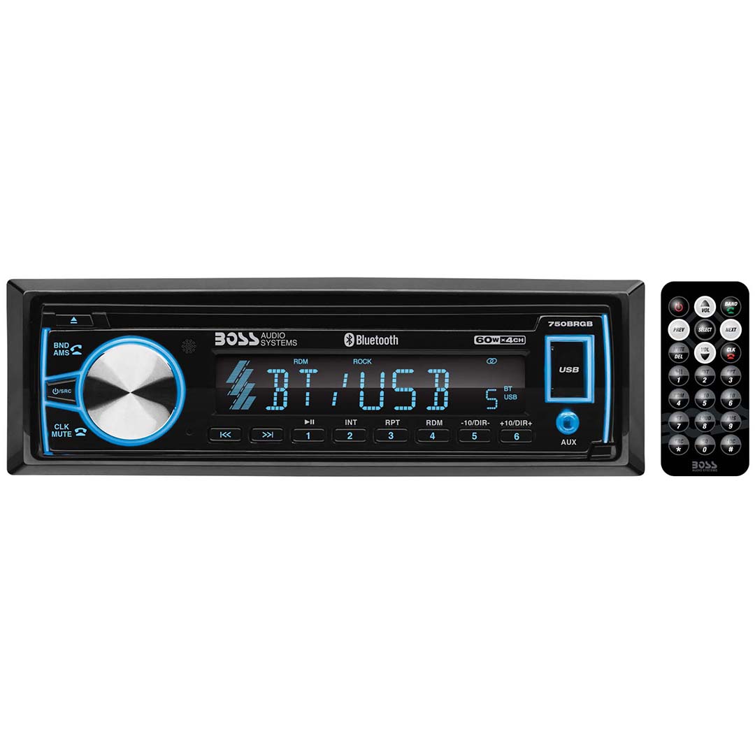 Turn Up Your Tunes With The Boss Audio 750Brgb Single-Din Cdmp3 Player Slide In A Cd, Connect Your Smartphone Or Mp3 Player To The Auxiliary Input, Turn On The Amfm Radio Or Plug Into The Usb Port For More Music Options You Can Also Charge Usb Devices With The Usb Port Bluetooth Technology Lets You Play And Control Music Apps Like Pandora And Spotify And Make Calls Hands-Free Choose Your Sound Style With The Built-In Preset Eq And Change The Color With The Multi-Color Illumination Options Control It All With The Wireless Remote To Deter Theft, Detach The Front Panel When You Arrive Get More Choice For Great Music With The Boss Audio 750Brgb For Further Product Details, Please Scroll Down