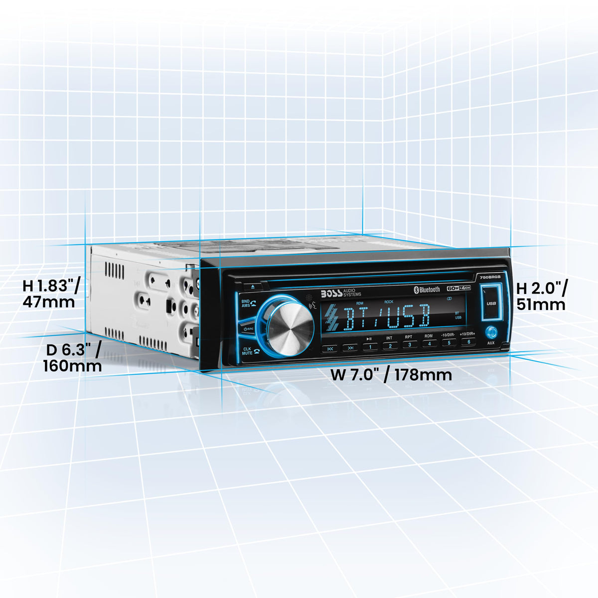 Q: What are the dimensions and weight of the BOSS Audio 750BRGB?A: The BOSS Audio 750BRGB measures 6.3 inches in length, 7.0 inches in width, and has a weight of 2.75 lbs, making it a compact and lightweight option for your car.