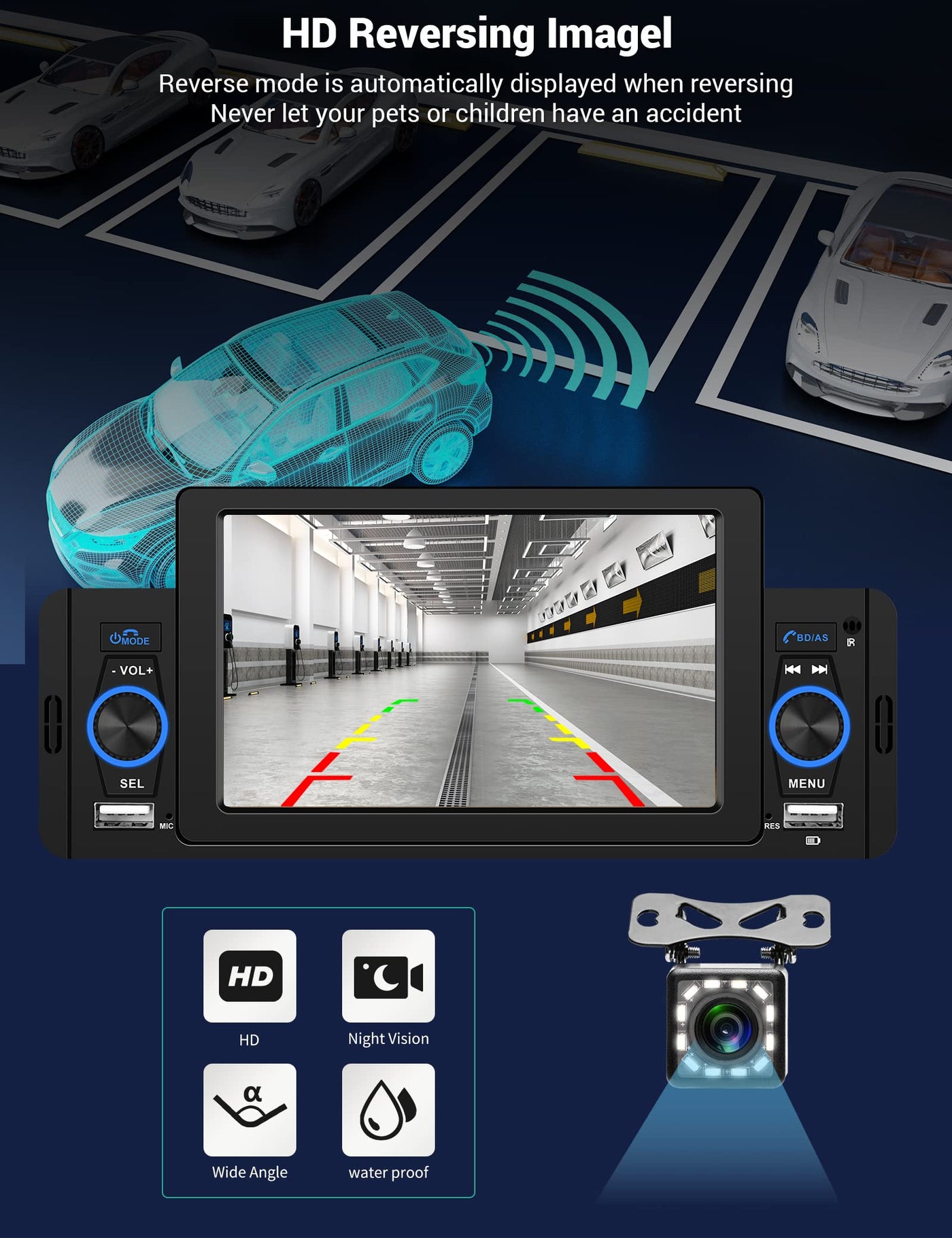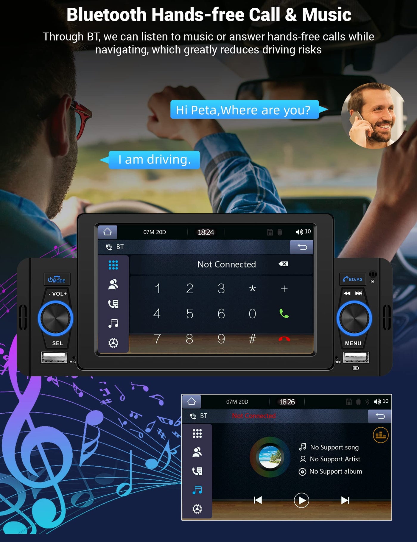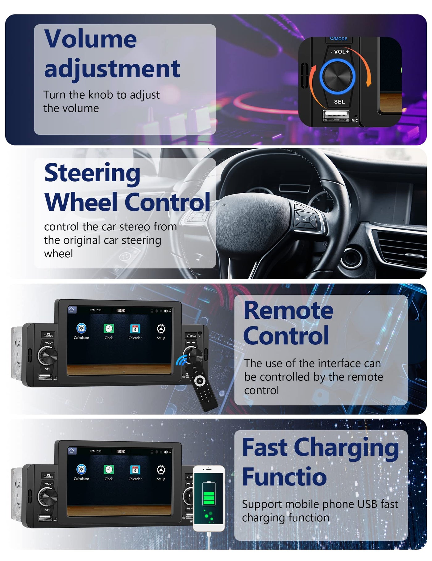 Meteeser 5 Inch Touchscreen Single Din Car Stereo With Carplay/Android Auto/Backup Camera Compatible With Car Play/Android Auto/Phone Mirror-Link 5 Inch Touch Screen 5 Inch Capacitive Touch Screen With High Resolution, Support 1080P Video Playback. Bluetooth Connects To The Phone'S Bluetooth And Downloads The Phone'S Address Book, Support Hands-Free Calling, Bluetooth Music. Built-In/External Mic Built-In Clear Mic And Equipped With External Mic Jack,Make Sure You Can Get A Clear Bluetooth Call, External Microphone Is Included. Fm Radio High-Quality Digital Stereo Fm Radio,18 Stations Can Be Preset, You Can Listen To Real-Time Radio, Weather Forecast, News. Backup Camera The Car Radio Supports Rear View And Will Display The Image Automatically When The Vehicle Shifts Into Reverse. Hd Night Vision Rear View Camera Is Included. Wireless Remote Control Control Every Action With The Included Wireless Remote Control Which Is Great For Passengers And Provides Amazing Accessibility. 4 Modes Input Support Up To Four Different Audio Input Modes, Including Usb/Aux/Bluetooth/Tf. 7 Colors Backlit Buttons 7 Colors Which Switch Automatically, Its Also Possible To Set A Unique One Of Your Choice. Two Usb Ports Two Usb Ports On The Front Panel, Support Phone Fast Charging/Usb Flash Drive.