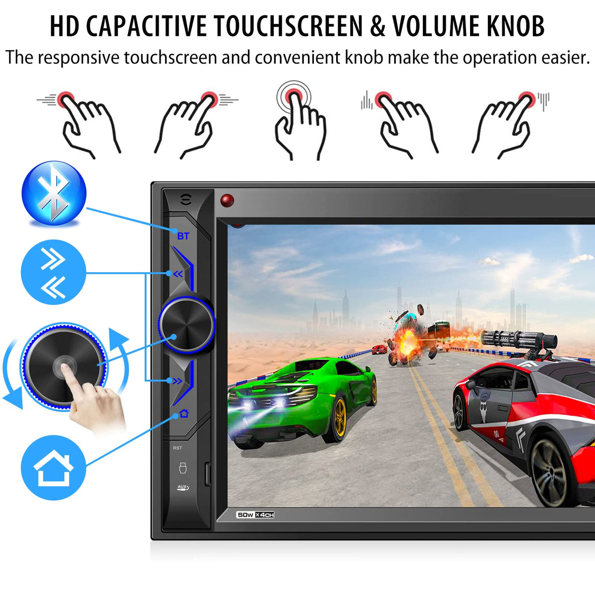 Soundkits Double Din Bluetooth Car Stereo Mechless Digital Media Audio Receiver Enjoy A More Safe And Convenient Driving Experience With Highly Responsive 7-Inch Hd Capacitive Touchscreen Monitor, A User-Friendly Interface And Smart Multi-Functions. Phone Mirroring To Your Smartphone For Gps Navigating To The Places You Want To Go. Bluetooth Technology Lets You Stream Music And Make/Answer Hands-Free Calls. Reach To Your Favorite Playlists By Hooking Your Smartphone Or Mp3 Player With Aux Input. Making Sure Your Parking Is Easy And Safe With The Hd Backup Camera. Choosing Your Favorate Sound Style With The Built-In Preset Eq. Charging Your Usb Powered Devices Through The Usb Ports. Convenient Knob Makes The Operation Easier. Listening To The Am/Fm Radio Or Playing 1080P Video With Usb Storage Or Microsd During Long Journey. Easier Installation And Perfect Fit In Standard Double-Din Stereo Openings. Install Kit May Be Required Depending On The Year And Make Of Your Vehicle. Steering Wheel Controls & Ir Remote Control Left & Right Pre-Amp & Subwoofer Outputs Different 7 Color Led Buttons Switchable Us And European Tuner Mechless No Cd Or Dvd Player 50 Watts X 4 Max Power Dc 12V Working Voltage