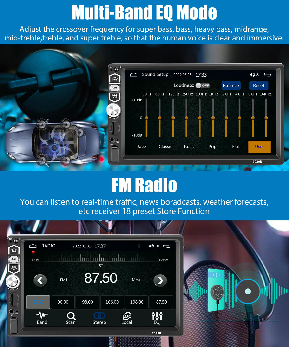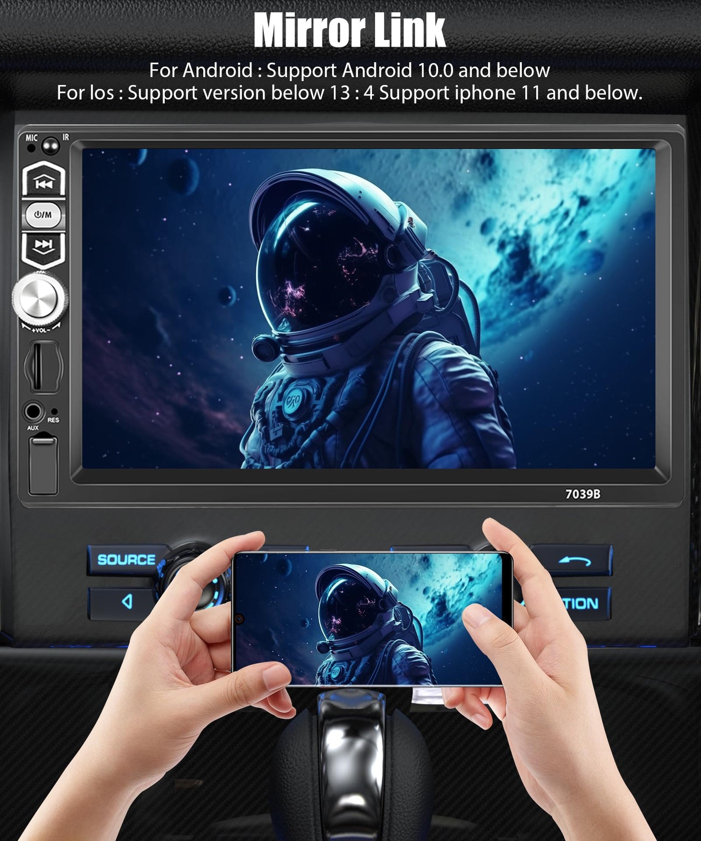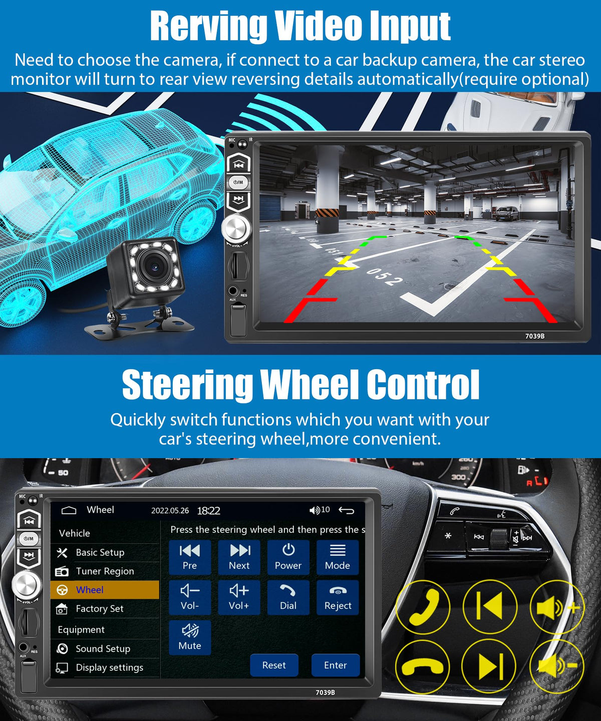 Features ?Carplay / Android Auto, Use Usb Data Cable To Connect. ?Screen: 7-Inch High-Definition Video Playback ?Mirror Link: Support Android/ Iphone Mirror Link ?Built-In Bluetooth Function ?Fm Radio: 18 Preset Store Function ?Support Steering Wheel Control Function ? Rear View Camera Input Function ? Colorful Backlight Settings ?Aux Audio Input Interface Supports External Mp3, Mobile Phones, Music Players, Etc. Specification: System: Wince Model: 7039B Size: 7.0 Inches Voltage: 12V Audio Amplifier: 7388 Bluetooth: 5.1 Screen Resolution: 1024*600 Output Power: 4*45W Usb Interface: Usb2.0 Reversing Input: Cvbs Radio Range: Fm 87.5-108.0Mhz (Europe) Frequency Range:2402.0 Mhz-2480.0 Mhz Working Temperature: -10? ~ 60? Audio Format: Mp3/Wma/Wav/Ape/Flac Video Format: Mkv/Avi/Ts/Tp/Mp4/M4V Max Bit Rate (50Mbps-80Mbps) Package Included: 1 X Audio Player 1 X Power Cable 1 X Horn Cable 1 X Remote Control 1 X User Manual 1 X Rear View Camera 1 X Mic