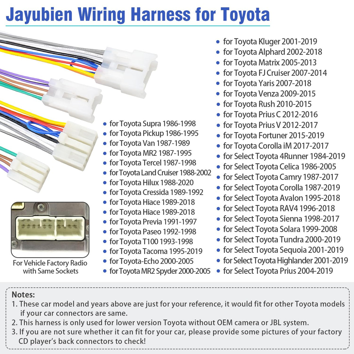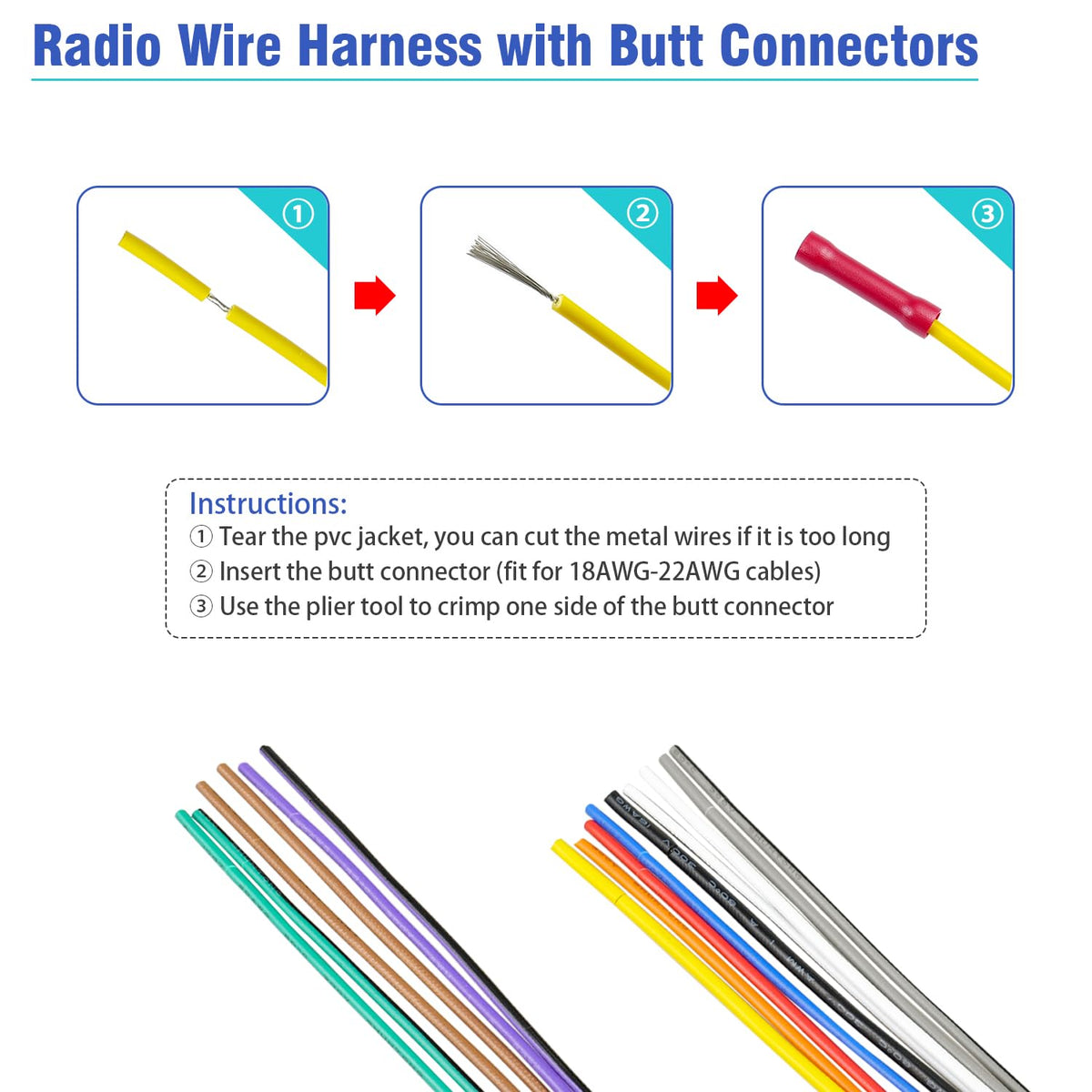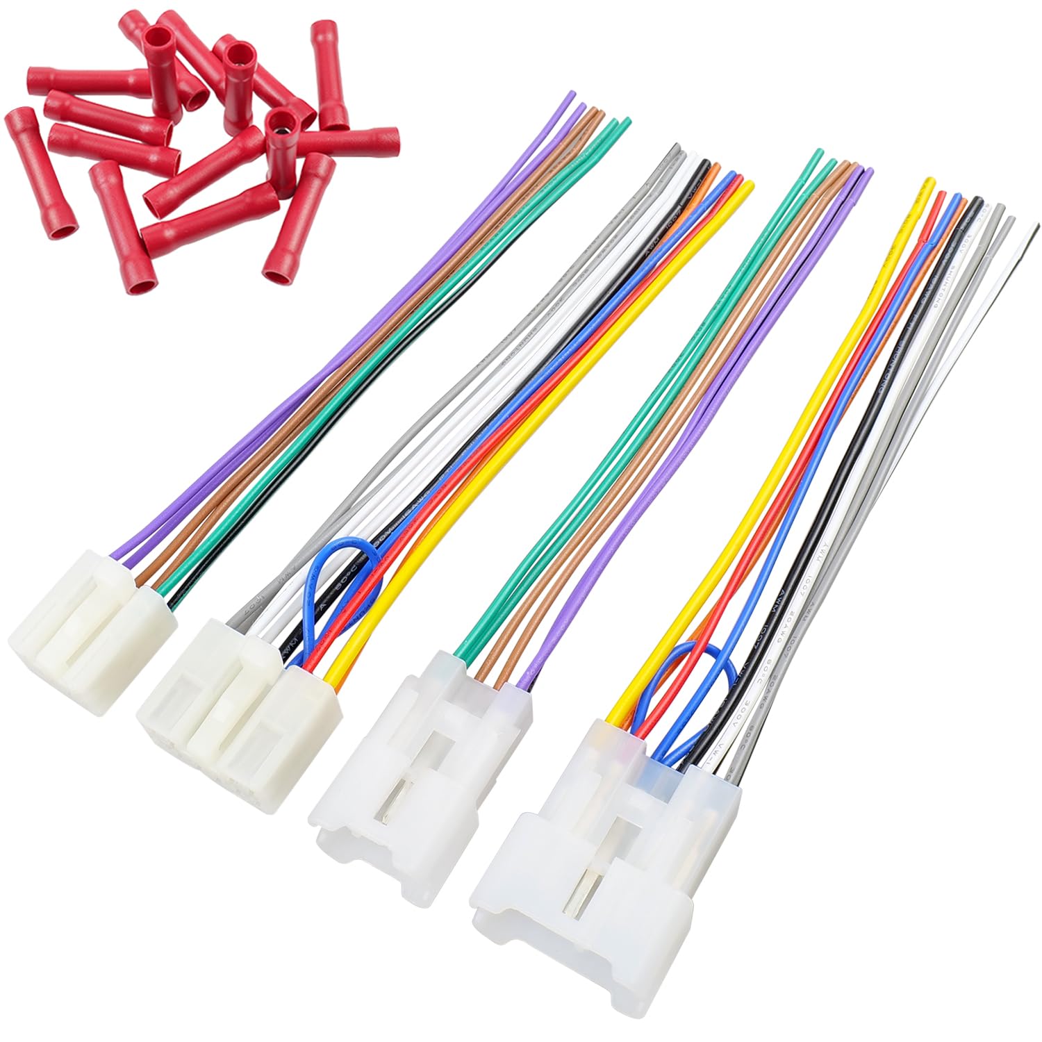 Product Package 2 X 10Pin Radio Wire Harness, Male To Female 2 X 6Pin Radio Wire Harness, Male To Female 16 X Butt Connectors Car Radio Wire Harness Compatible With For Toyota Supra 1986-1998 For Toyota Pickup 1986-1995 For Toyota Van 1987-1989 For Toyota Mr2 1987-1995 For Toyota Tercel 1987-1998 For Toyota Land Cruiser 1988-2002 For Toyota Hilux 1988-2020 For Toyota Cressida 1989-1992 For Toyota Hiace 1989-2018 For Toyota Previa 1991-1997 For Toyota Paseo 1992-1998 For Toyota T100 1993-1998 For Toyota Tacoma 1995-2019 For Toyota-Echo 2000-2005 For Toyota Mr2 Spyder 2000-2005 For Toyota Kluger 2001-2019 For Toyota Alphard 2002-2018 For Toyota Matrix 2005-2013 For Toyota Fj Cruiser 2007-2014 For Toyota Yaris 2007-2018 For Toyota Venza 2009-2015 For Toyota Rush 2010-2015 For Toyota Prius C 2012-2016 For Toyota Prius V 2012-2017 For Toyota Fortuner 2015-2019 For Toyota Corolla Im 2017-2017 For Select Toyota 4Runner 1984-2019 For Select Toyota Celica 1986-2005 For Select Toyota Camry 1987-2017 For Select Toyota Corolla 1987-2019 For Select Toyota Avalon 1995-2018 For Select Toyota Rav4 1996-2018 For Select Toyota Sienna 1998-2017 For Select Toyota Solara 1999-2008 For Select Toyota Tundra 2000-2019 For Select Toyota Sequoia 2001-2019 For Select Toyota Highlander 2001-2019 For Select Toyota Prius 2004-2019 For Subaru Legacy 2010-2019 For Subaru Forester 2010-2019 For Subaru Brz 2012-2019 For Subaru Wrx 2012-2019 For Subaru Impreza 2012-2019 For Subaru Outback 2013-2019 For Subaru Crosstrek 2015-2019 Warm Tips 1. These Car Model And Years Above Are Just For Your Reference, It Would Fit For Other Toyota Subaru Models If Your Car Connectors Are Same 2. This Harness Is Only Used For Lower Version Toyota Subaru Without Factory Jbl Amplifier How To Use The Butt Connectors A. Tear The Pvc Jacket, You Can Cut The Wires If It Is Too Long B. Insert The Butt Connector, Fit For 18Awg-22Awg Cables C. Use The Plier Tool To Crimp One Side Of The Butt Connector