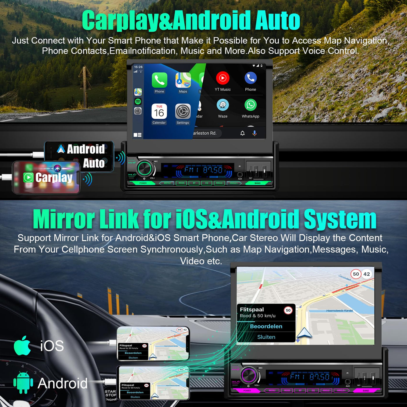 Upgrade Your Car'S Audio System With The Single Din Apple Carplay Car Stereo With Android Auto. This 7-Inch Flip-Out Touchscreen Car Stereo Offers An Immersive Multimedia Experience With Its Motorized And Colorful Screen. With Bluetooth Connectivity, You Can Easily Stream Music And Make Hands-Free Calls. The Mirror Link Feature Allows You To Connect Your Smartphone And Access Its Apps Directly On The Stereo'S Display. Equipped With Apple Carplay And Android Auto, This Car Stereo Ensures Seamless Integration With Your Smartphone, Giving You Access To Your Favorite Apps, Navigation, And Voice Control. The Hd Backup Camera Ensures Safe And Convenient Parking, While The Usb And Aux Inputs Allow You To Connect Various Devices. Tune In To Your Favorite Am/Fm Radio Stations And Enjoy High-Quality Sound With The Built-In Subwoofer And Dsp Technology.